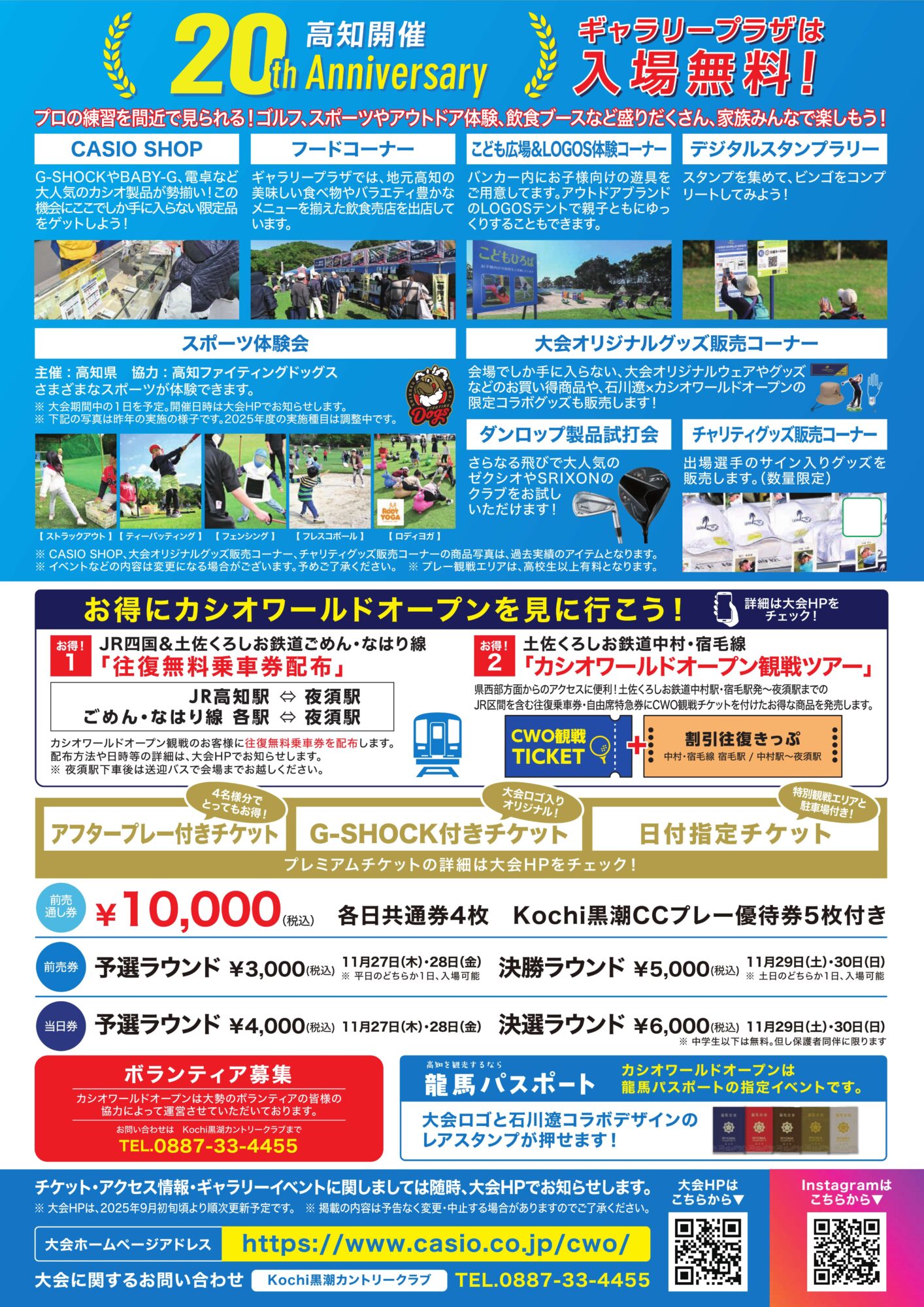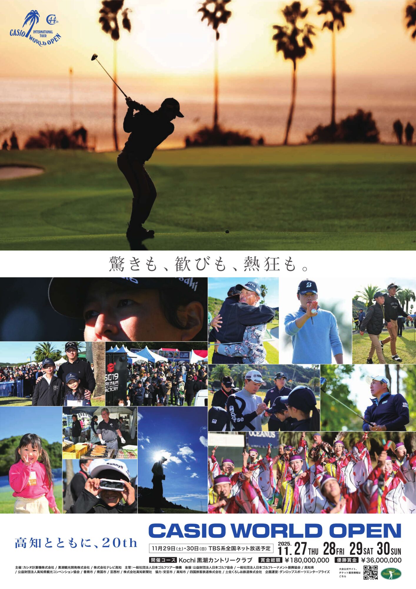 作为国内男子高尔夫巡回赛的最后一场比赛,以大赛东道主、卡西欧所属的石川辽选手为首的职业高尔夫选手争夺奖金王和种子权展开了热战的本次大会,为了纪念高知举办的第20届,除了向20多岁的人免费开放观战区域之外,每天向先到的2000名客人分发小说商品。