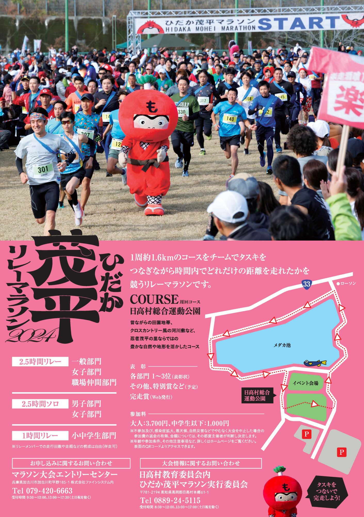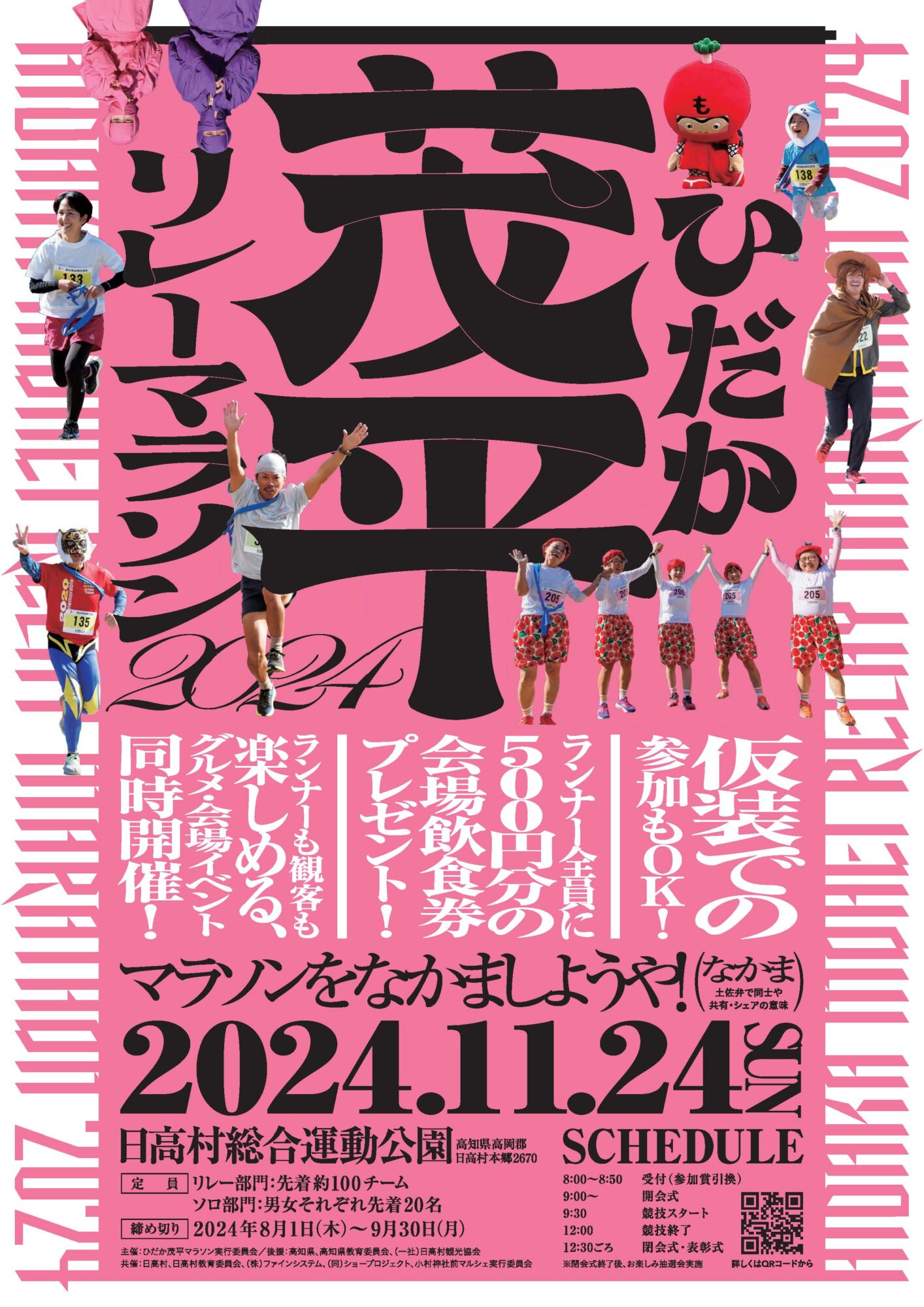 从日高村综合运动公园绕日下川调整池一周约1.6km的特设路线,由队伍一边连接塔斯基(含测量芯片),一边比赛在限制时间内跑了多少距离。此外,除了跑步者以外也能享受的会场活动非常多。小村神社前马歇尔的饮食展位也预定开店。请和朋友、家人、职场的朋友约好后再参加。扮装参加也OK!奔跑,玩,尽情享受日高村吧!
