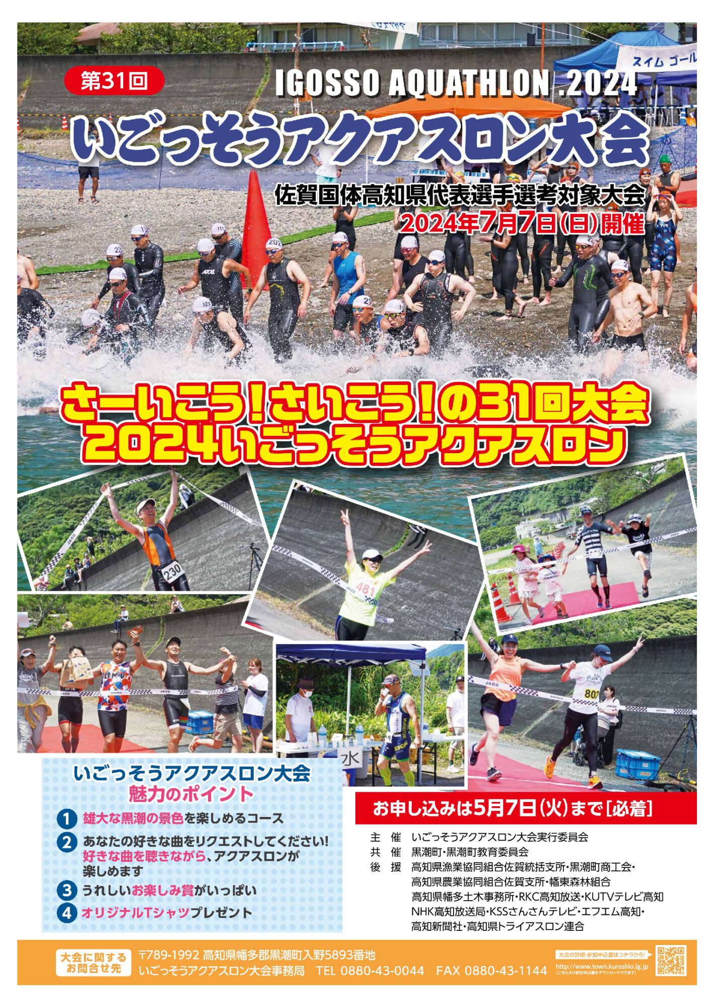 高知县的发祥地是黑潮町·佐贺,在游泳和跑步的短距离比赛中也设有面向初学者的部门。大会前一天还会举办“亲密接触鲣鱼派对”。钓一条鲣鱼的渔夫町黑潮町佐贺的塔奇使用了当天钓到的新鲜鲣鱼。在AQUAS朗的兴奋的同时,可以享受到日本第一的鲣鱼的味道。