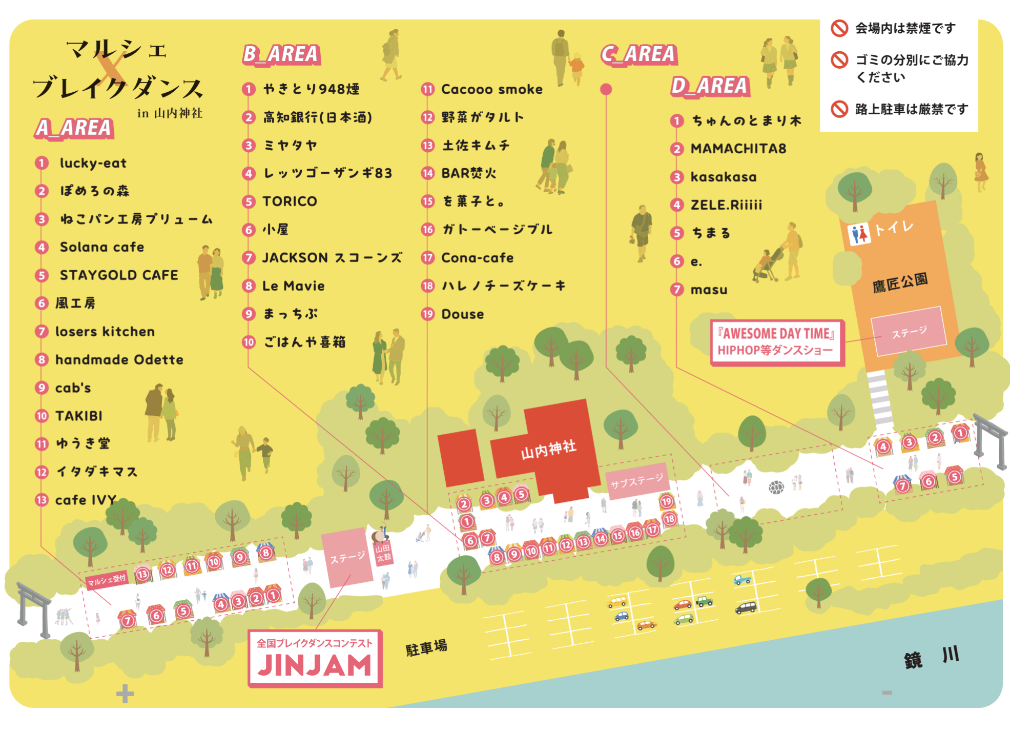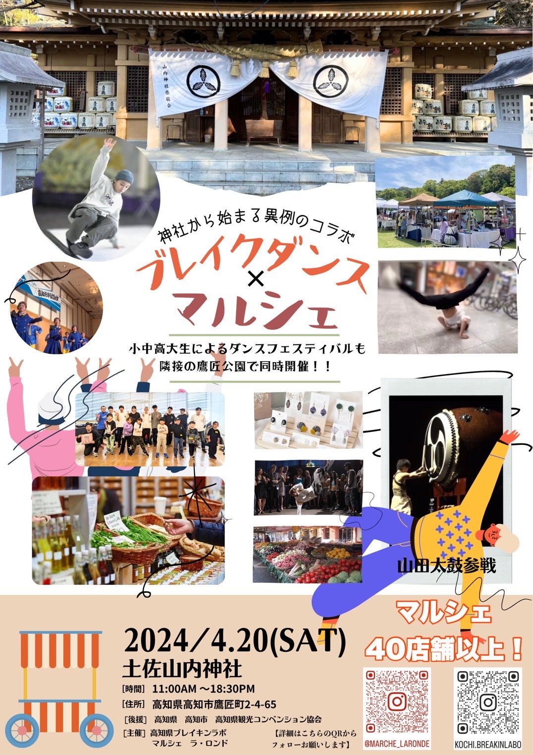 霹雳舞大赛和马歇尔同时举行!来自全国各地的布莱克舞者将会场卷入狂热的漩涡中。在Marche可以享受40家以上店铺的美食、饮料和杂货。和山田太鼓的合作也值得一看。鹰匠公园还会举办孩子们的舞蹈节。