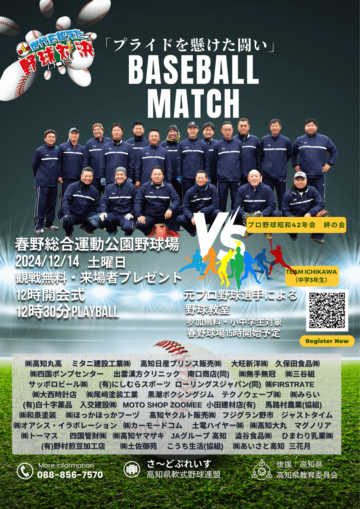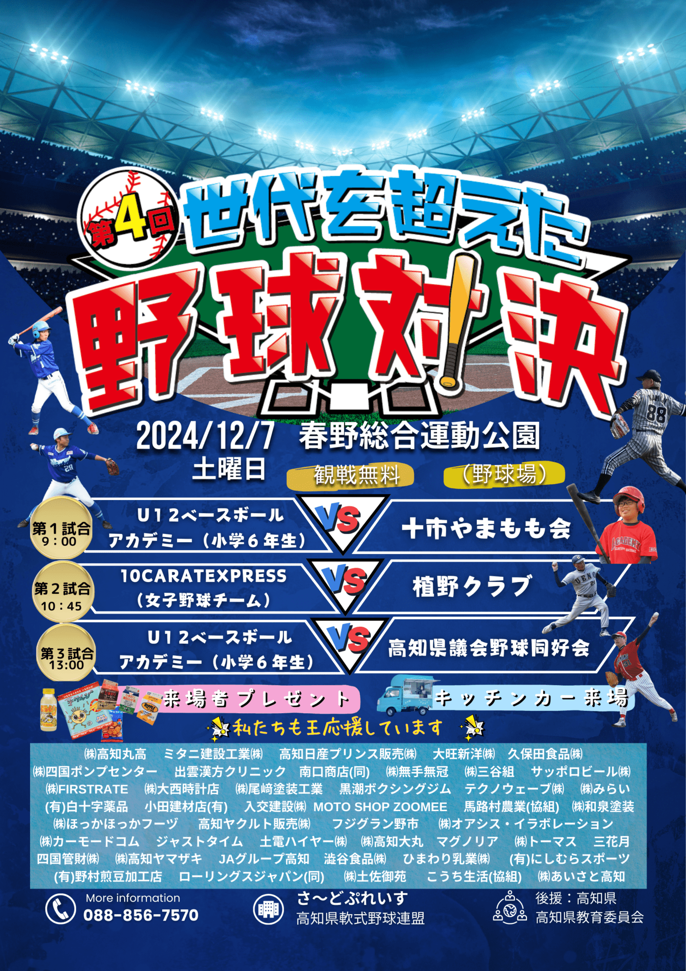 举行超越世代的棒球对决。12月14日,包括往年的明星、活跃在巨人队的桑田真澄在内的队伍和高知县的初中3年级队伍将进行认真比赛。会场上也有来场的礼物和厨房的分店,请一定要来。
