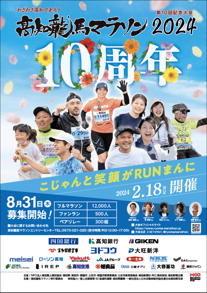 高知龙马马拉松是本县强项的人的温暖、款待、丰富的自然和高知特有的美食大会。在第10届的本次大会上,除了全程马拉松和芬兰之外,为了让马拉松初学者也能轻松愉快地参加,新设置了双人接力项目,请一定要趁这个机会挑战一下。