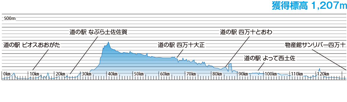 与最后的清流四万十川的景观融为一体的路线。前半部分,从四万十市向黑潮町方向走向大海的路线后,以四万十川上游为目标进入山间部,后半部分沿着四万十川下降。