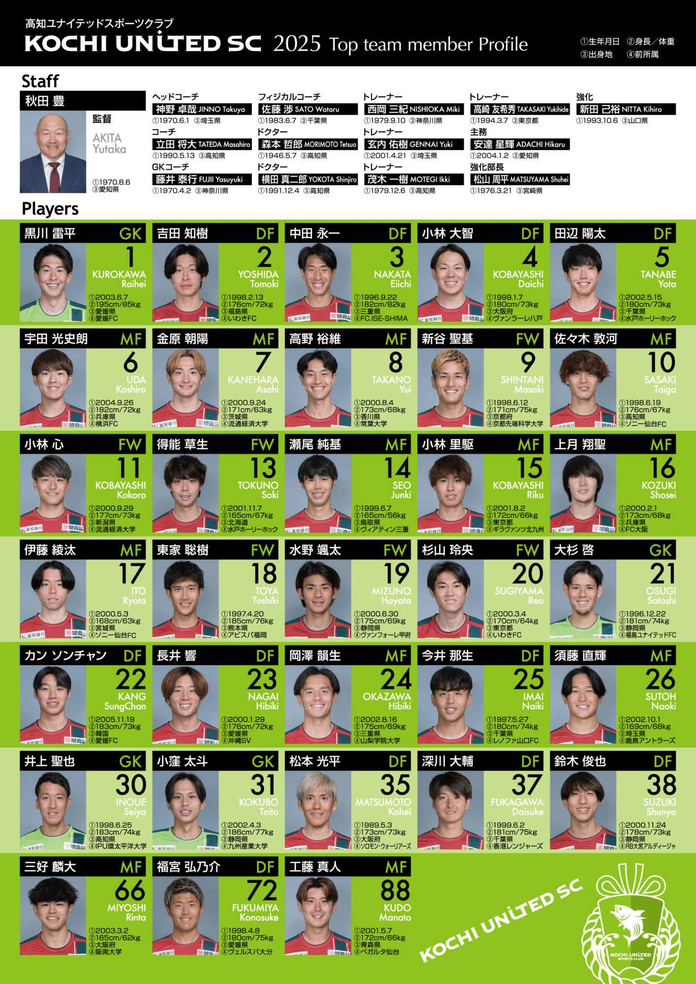 高知联合SC是以高知县为据点的足球俱乐部,于2016年由高知U Traster FC和爱戈索高知的合并而诞生。多年来,他在JFL(日本足球联盟)积累了实力,并于2024年赛季加入了J3联赛。