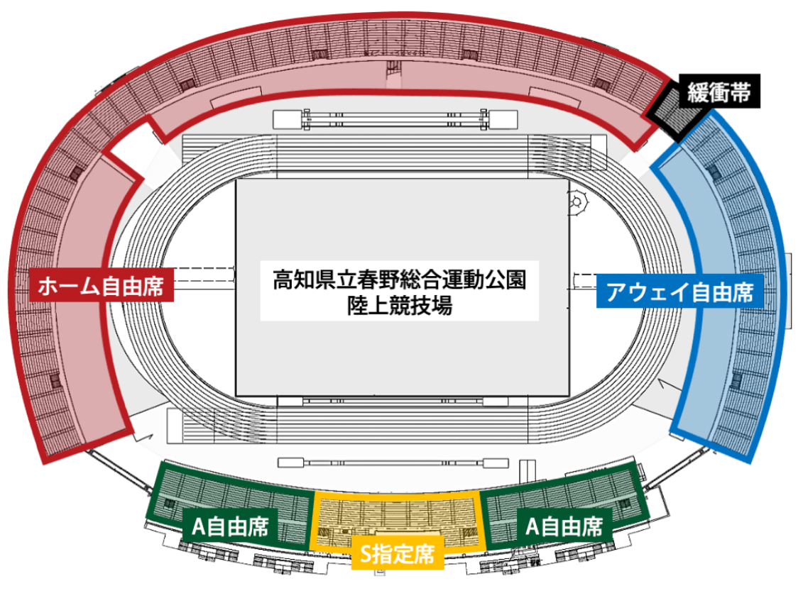 主场是高知县立春野运动公园陆上竞技场,收容人数为16010人。体育场被丰富的自然环境包围,比赛当天当地的美食展台和粉丝服务都很充实。在观看足球比赛的同时,可以充分感受到高知的魅力。