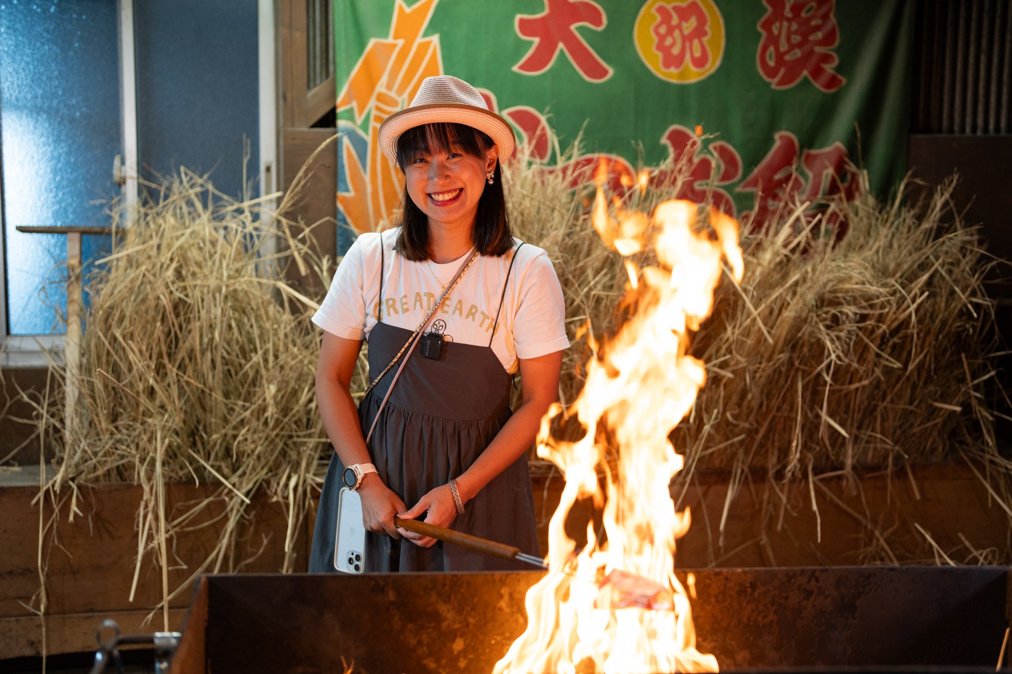 使用的是当天采购的新鲜鲣鱼和县产的稻草。工作人员说:“我从皮目开始烤。”把稻草放进去,火焰就会升起!