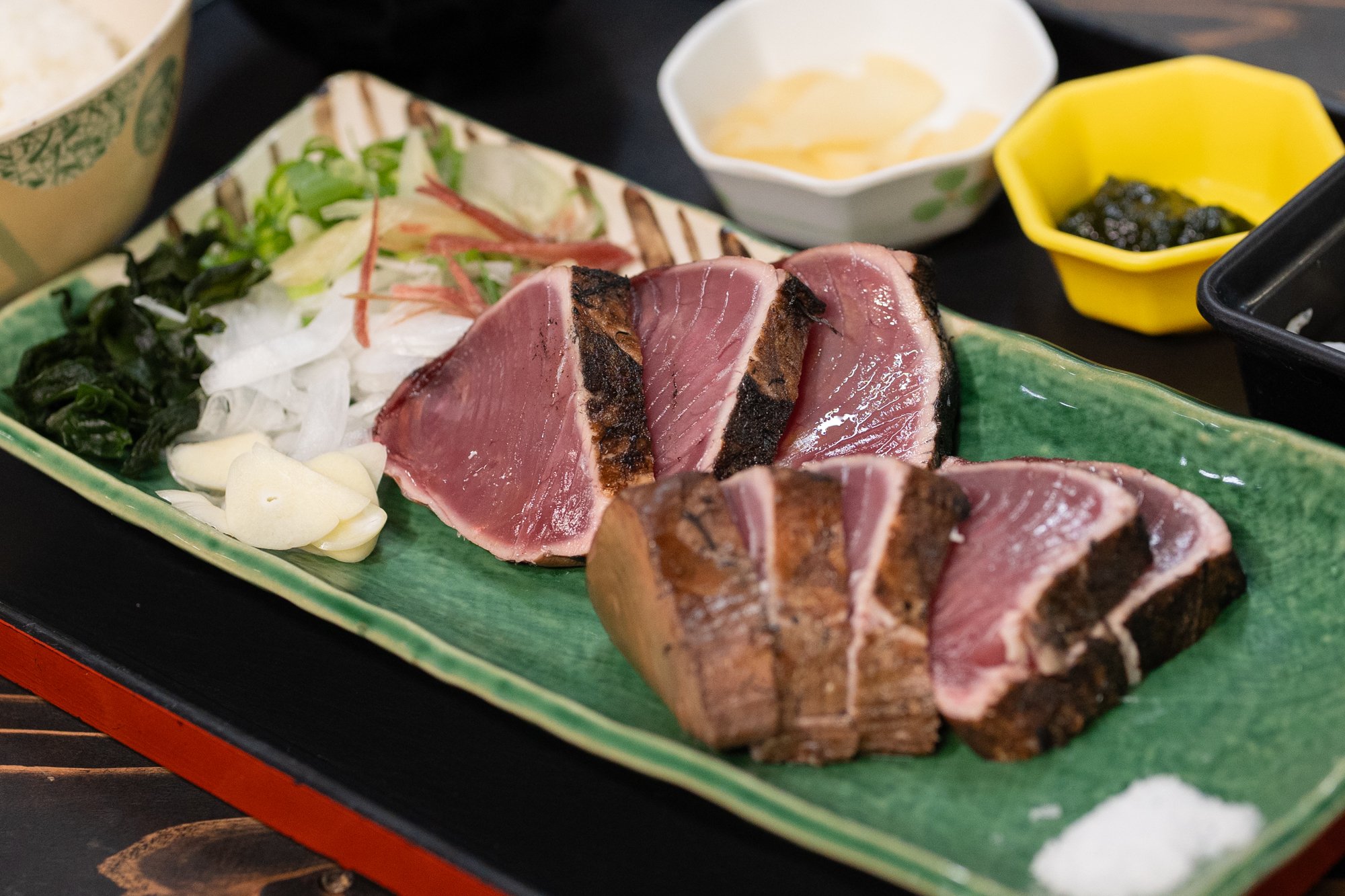 一面各1~2分钟。烤好的鲣鱼可以当场拿到。另外,在相邻的鲣鱼船商店,可以买到打包用的稻草烧章鱼。