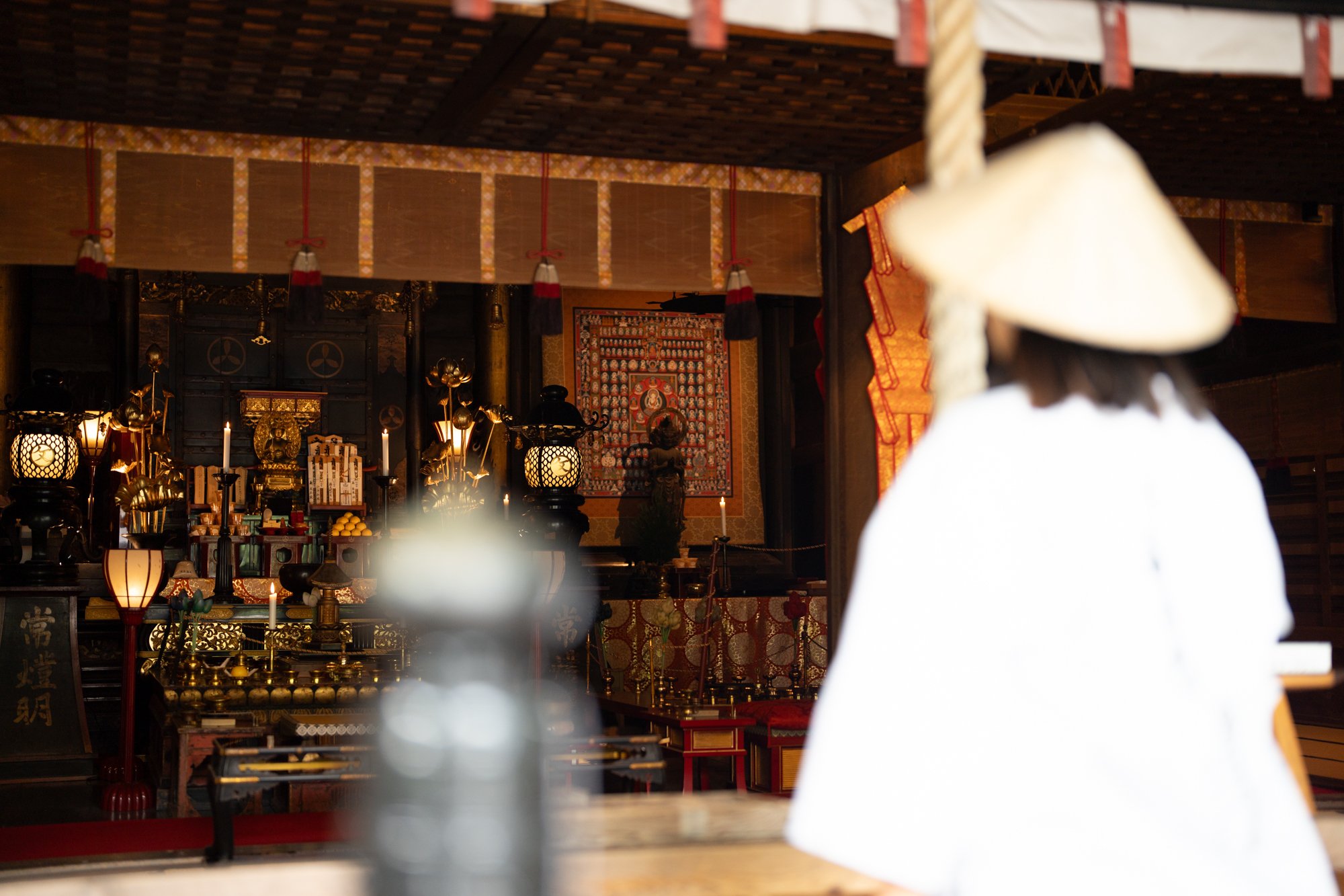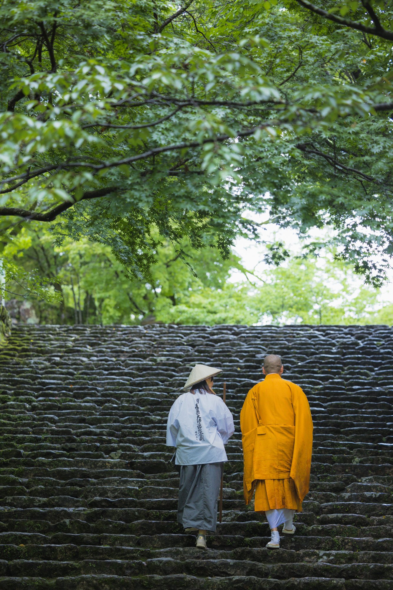 在四国巡礼中,掌握白色装束,戴着写着“同行二人”的菅笠,手持金刚杖巡游寺庙。“同行二人”与弘法大师在一起,金刚杖表示弘法大师本身。
