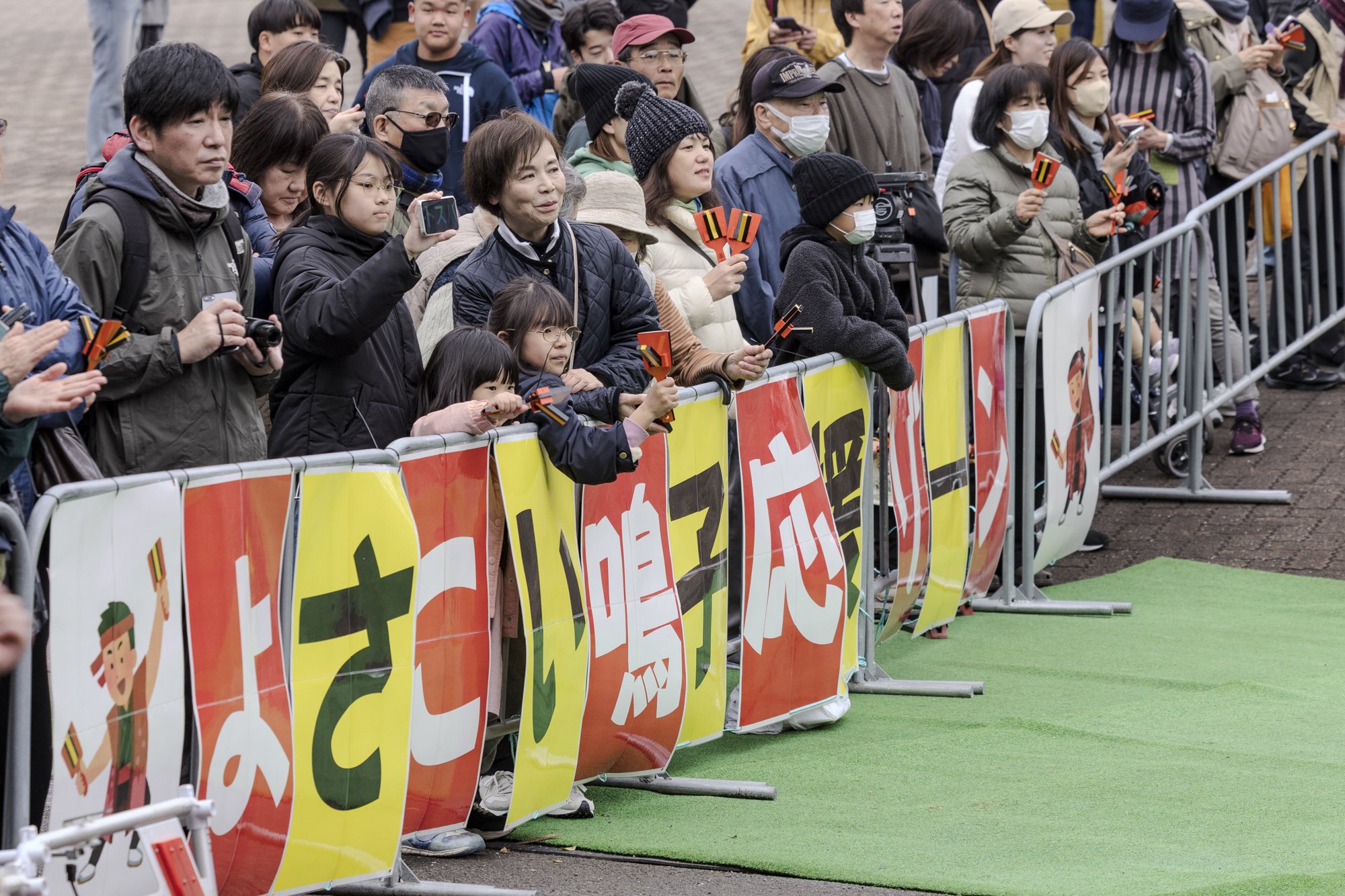 前往终点会场的春野陆上竞技场。在竞技场前的上坡路上,两侧聚集了很多人。鸣响YOSAKOI舞蹈中使用的“鸣子”应援的样子,只有高知才有。市民的声援在最后冲刺的莉安先生的背后推着。
