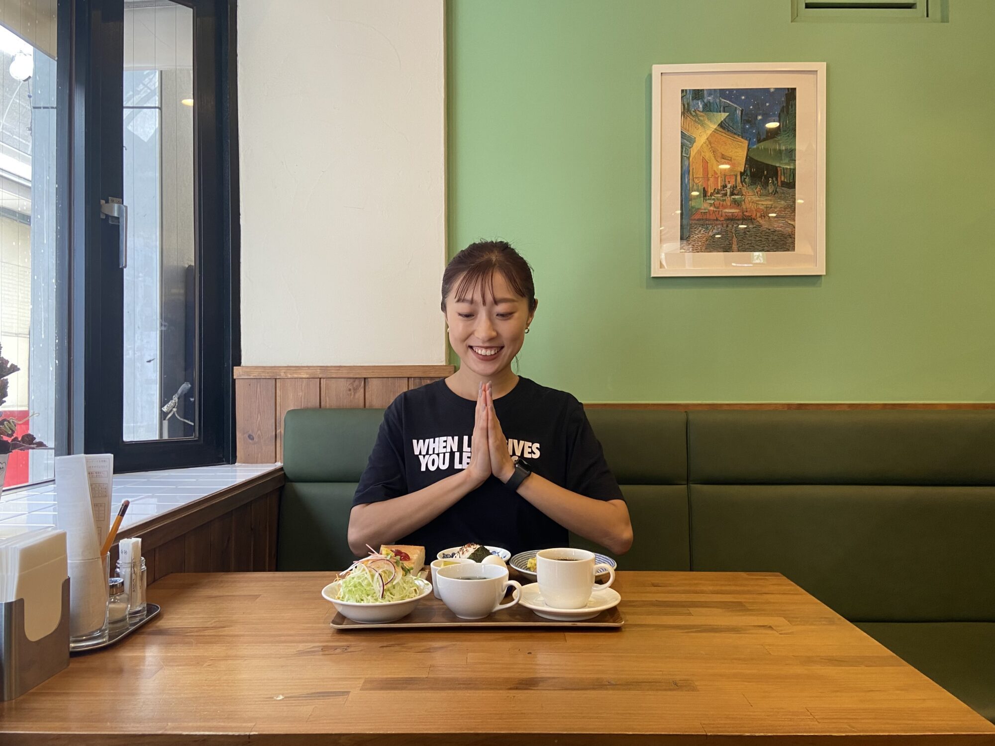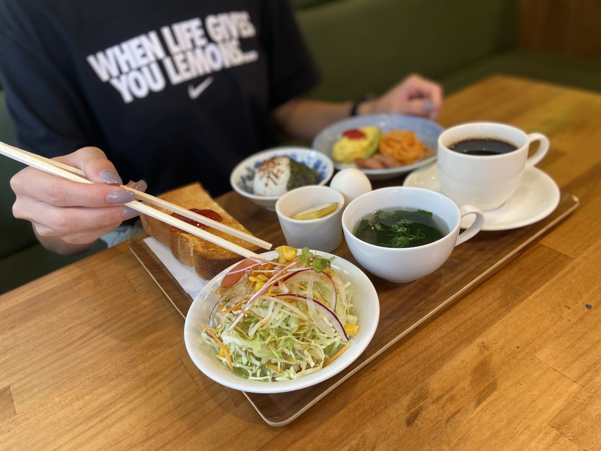 其特征是吐司、咖啡、饭团和味增汤等和洋混合的不可思议组合。虽然想吃面包,但是也想吃米饭,虽然想喝咖啡,但是也想喝味增汤,这是一道适度运动后适合饿肚子的分量十足的菜单吧。