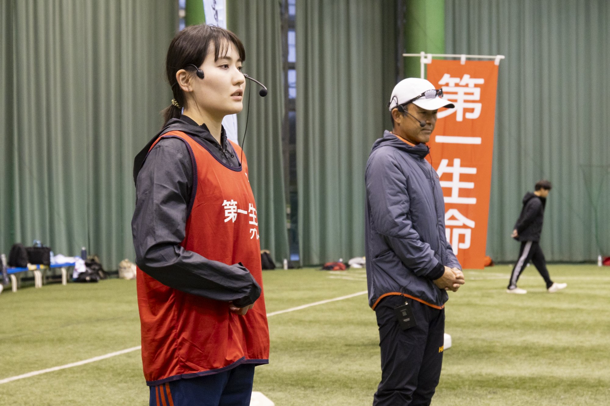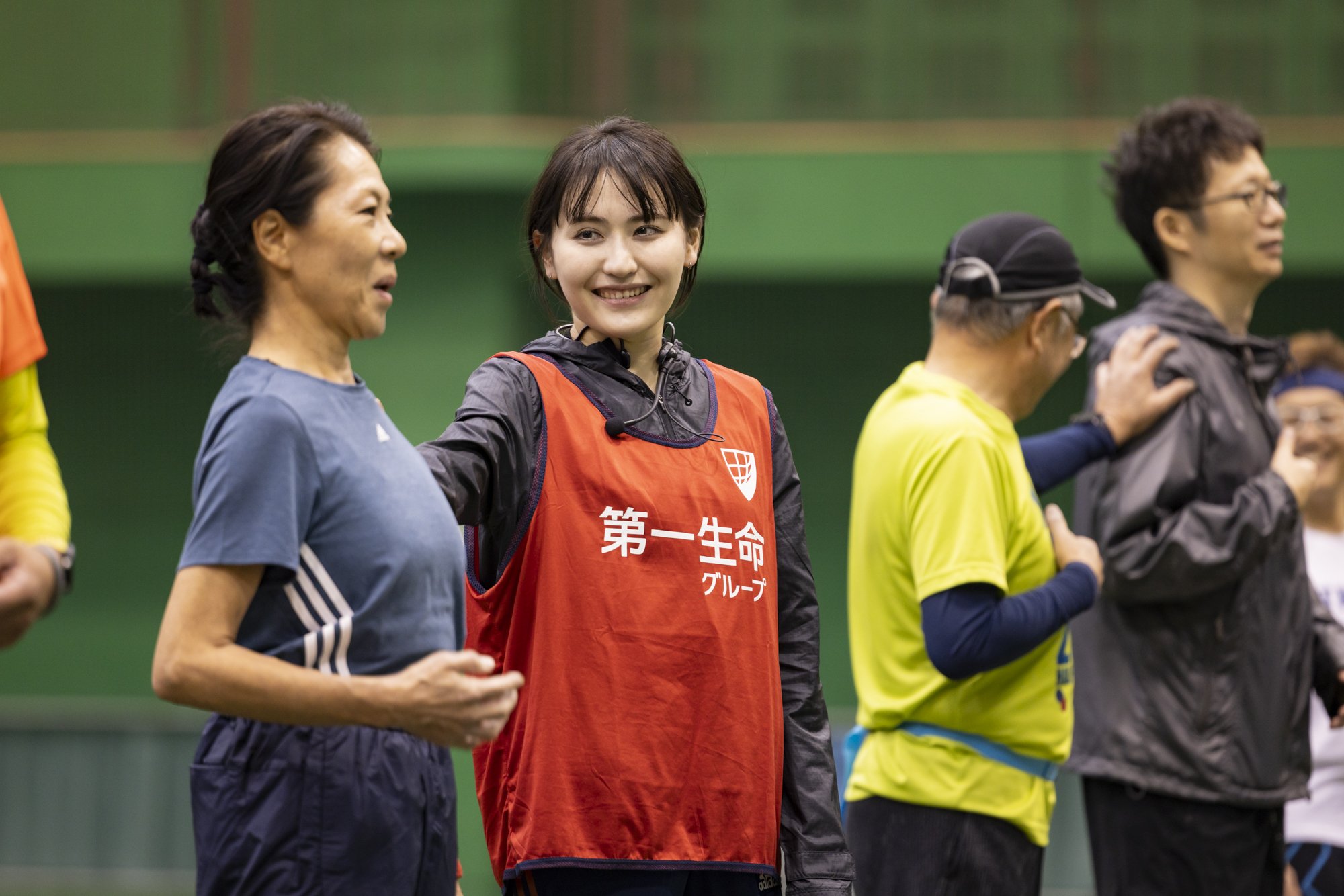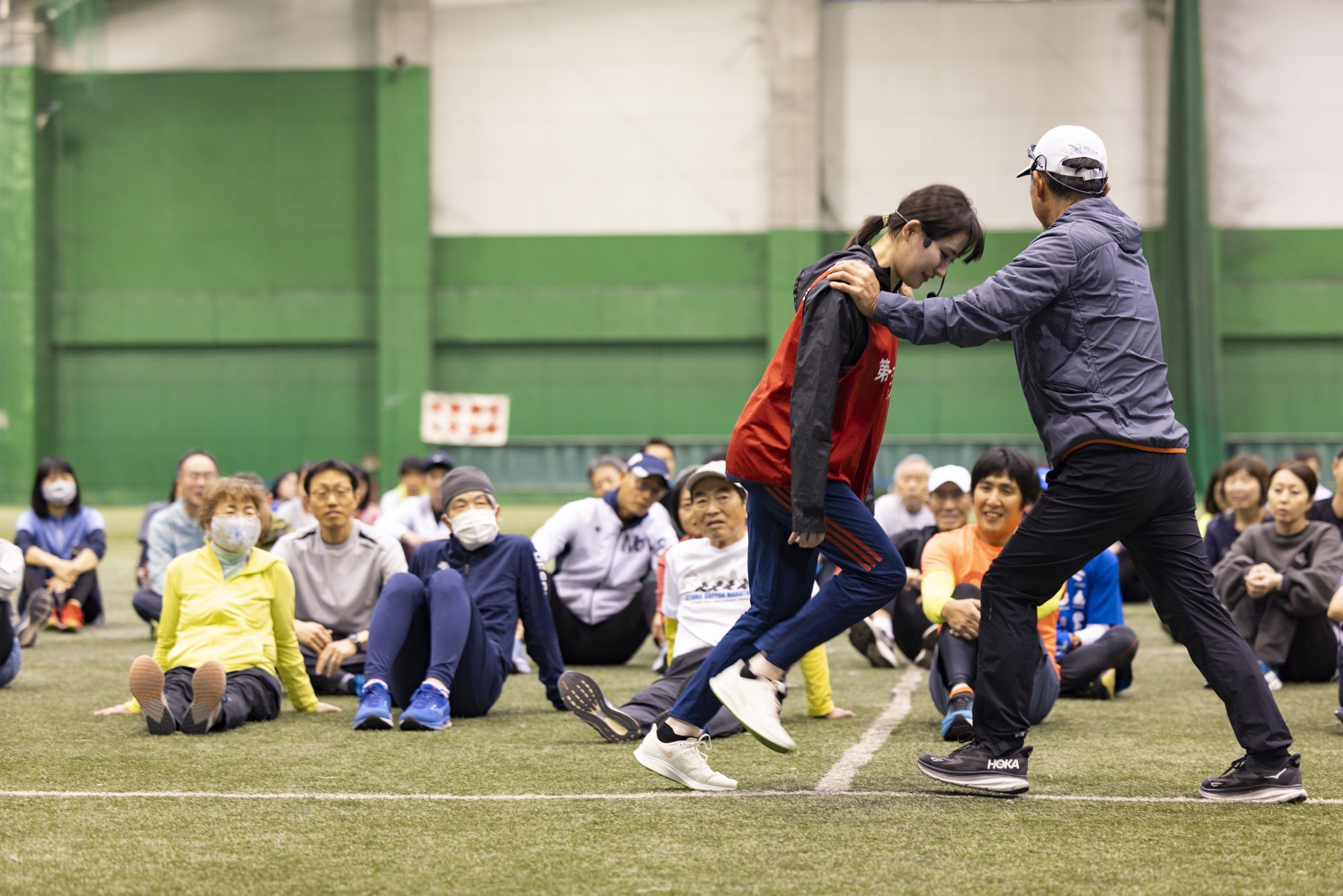 这次得到了第一生命株式会社的协助,现役时代活跃在第一生命团体女子田径部的佐野英里佳作为助手参加了研讨会。“今天,我想如果能帮助大家刷新记录就好了!”研讨会开始了。