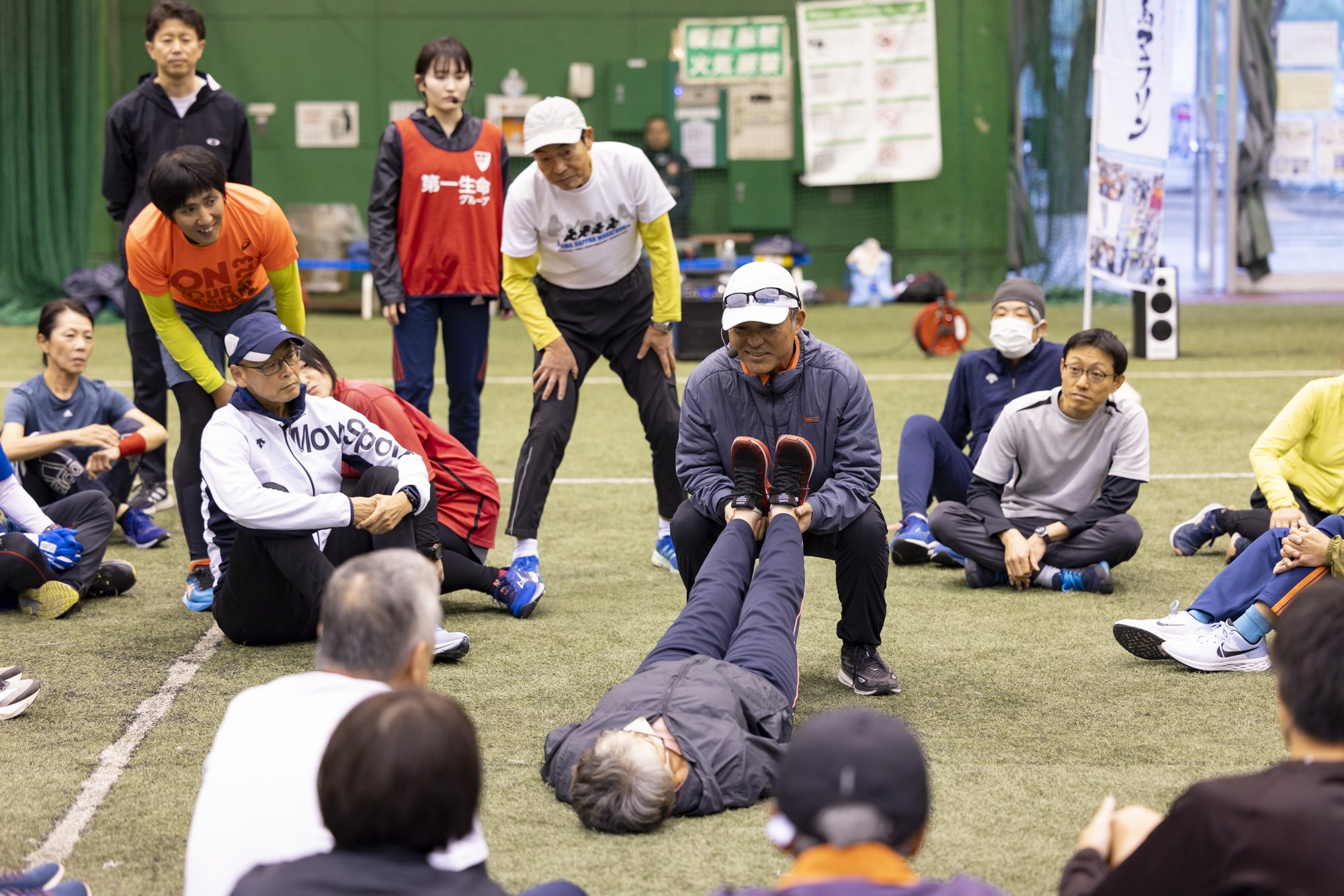 解说之后,是跑步前想做的基本伸展运动的演讲。参加者们学习了膝盖、股关节、阿基里斯腱、肩胛骨周围和关节周围一个伸展的方法。