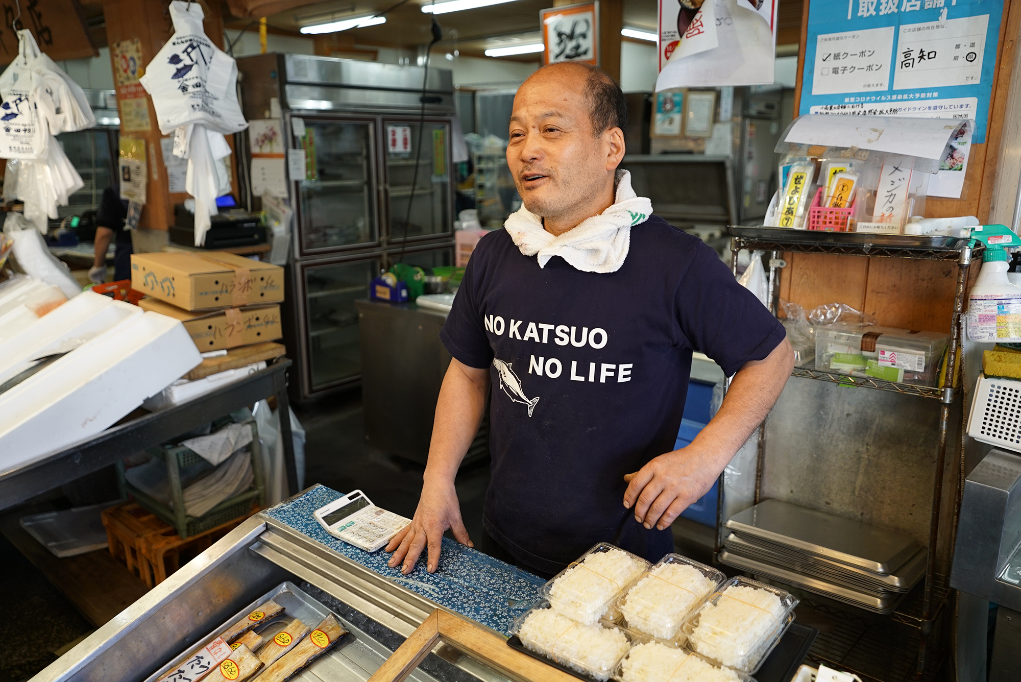 位于历史悠久的久礼大正町市场入口最里面,创业100多年的老字号“田中鲜鱼店”。田中隆博社长,从外表和手感中看清鲣鱼的身材,作为能够根据客人的喜好介绍的“鲣鱼侍酒师”而闻名。