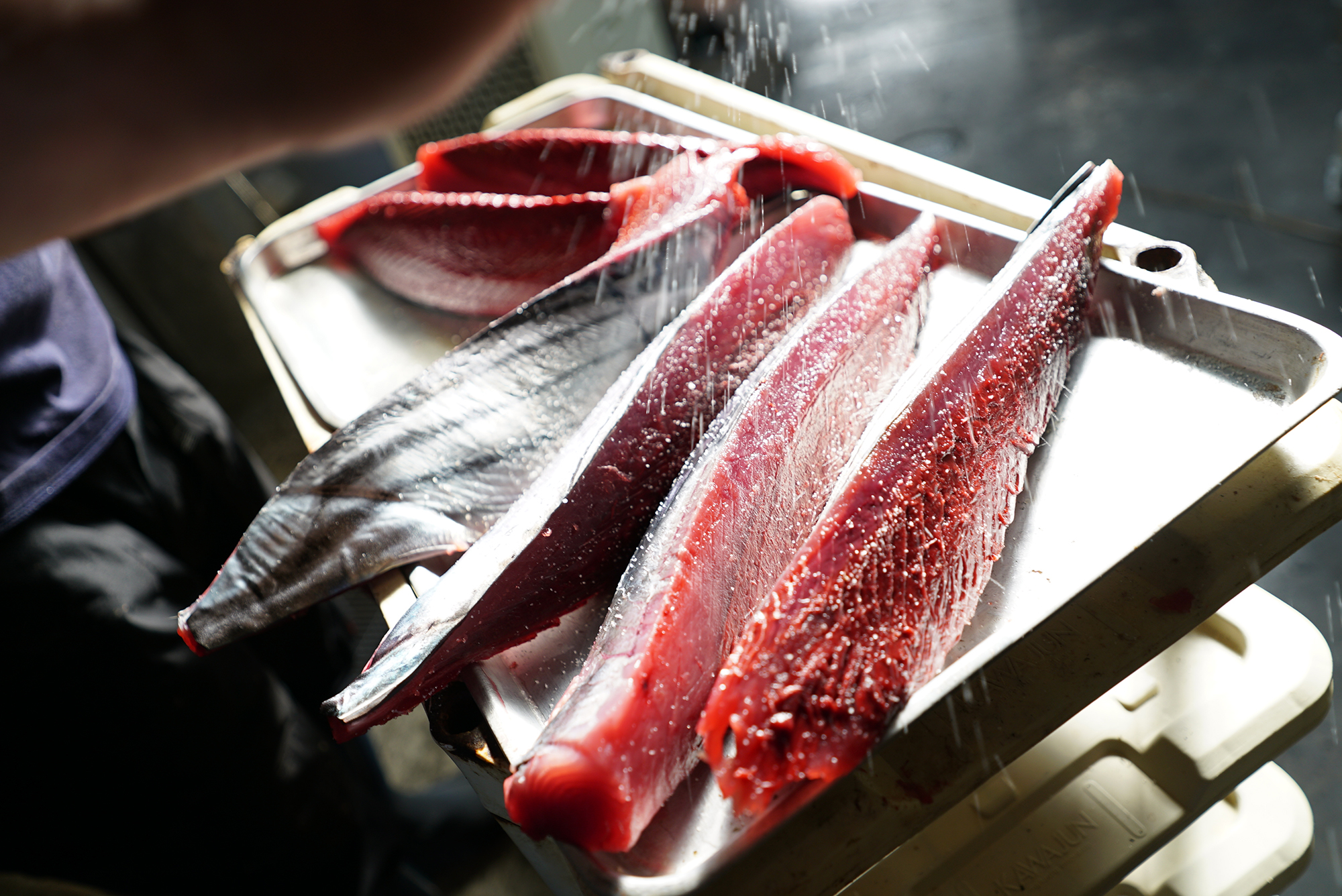 多年来,即使是看过鱼的眼光专业人士,也很难选择“没有比这更合适的鱼了”的鲣鱼。一般来说,在实际处理之前,不知道是不是被称为“goshi”的腥臭而不好的鲣鱼。从竞争的阶段开始筛选那样难的鱼的鲣鱼,一边处理一边确认身体的颜色和触感,只把能接受的东西摆在店里。在社长“不出不好的鲣鱼”的坚持下,只有真正好吃的鲣鱼排列着。另外,最大的魅力是买了被压倒性的眼光选出的新鲜鲣鱼,马上就能当场吃到。前往田中鲜鱼店对面的直营饮食处“渔夫小屋”。