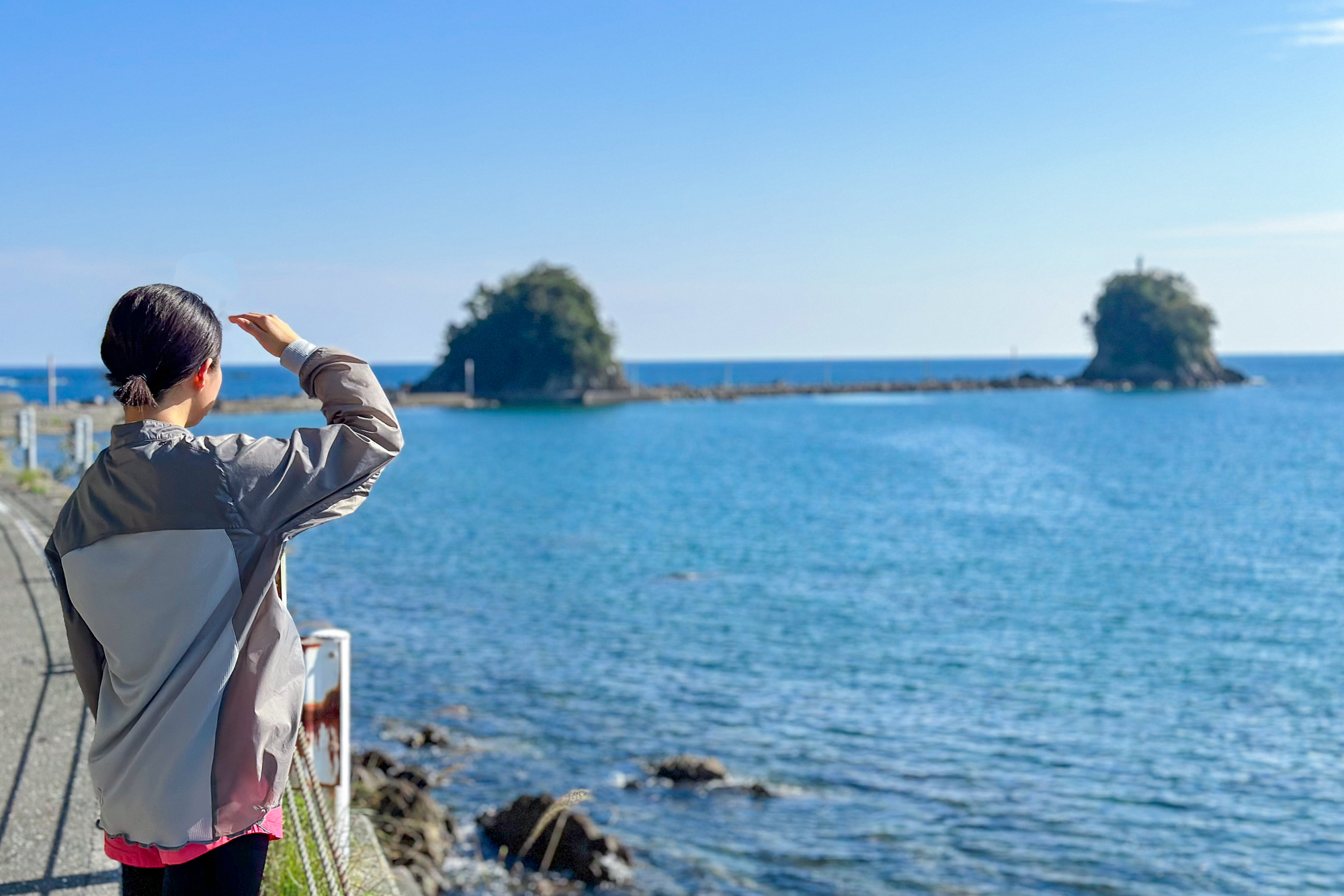 接下来的目标是“双名岛”。据说是土佐十景之一,在很久以前,鬼岛的鬼为了帮助苦于大浪的久礼的人们,运来了两块大石头。两个岛上分别供奉着观音和弁天,久礼的渔夫们在这个岛上祈祷航海和家人的安全。