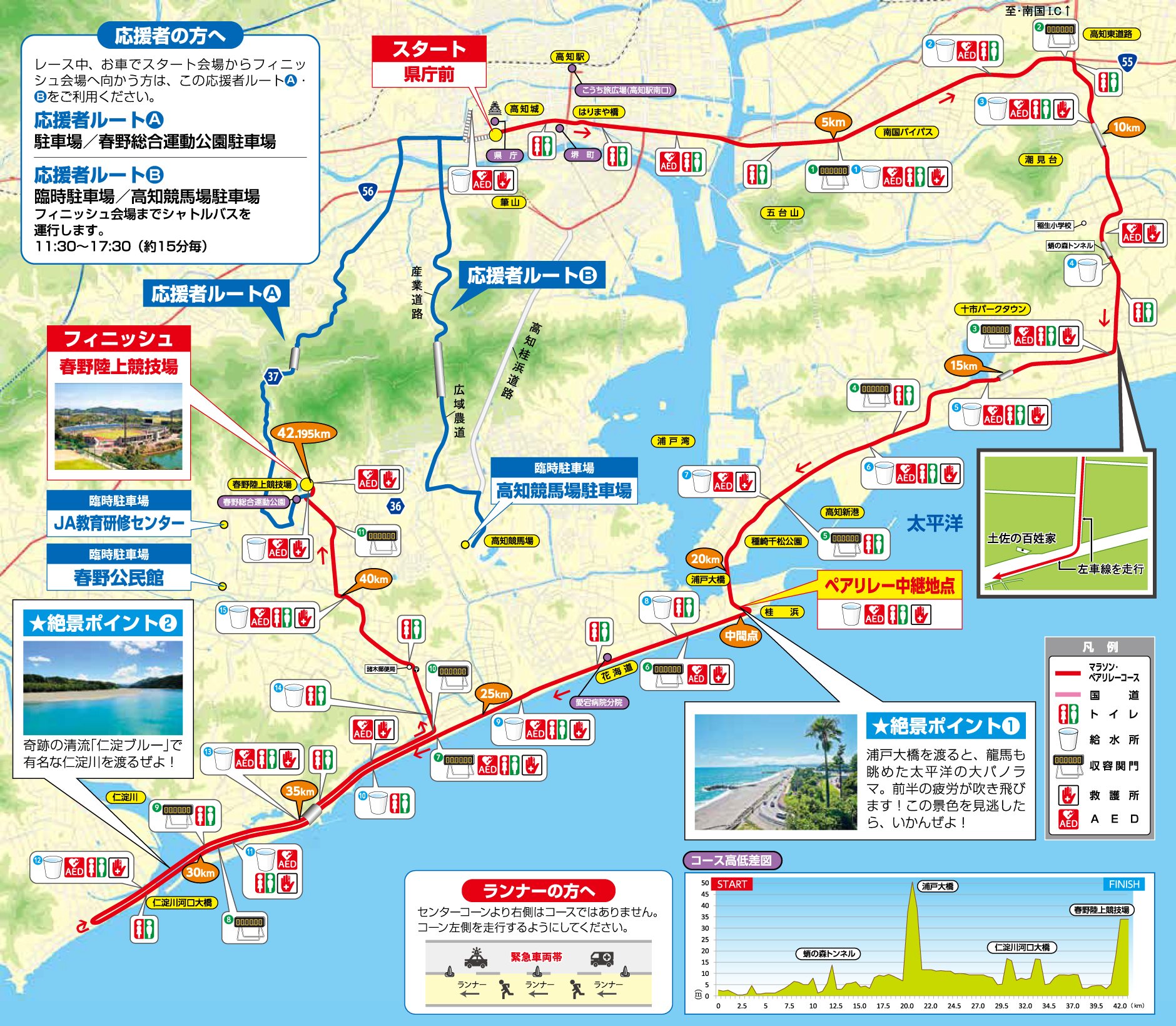 路线是范兰从县厅前到中央公园。全程马拉松从高知县厅前开始,穿过高知城下的市区,沿着南国市的田园奔跑,沿着仁淀川的河口折回,前往终点的高知县立春野陆上竞技场。中盘的浦户大桥和最后阶段的春野陆上竞技场前有很大的高低差,如何控制这里是重点。