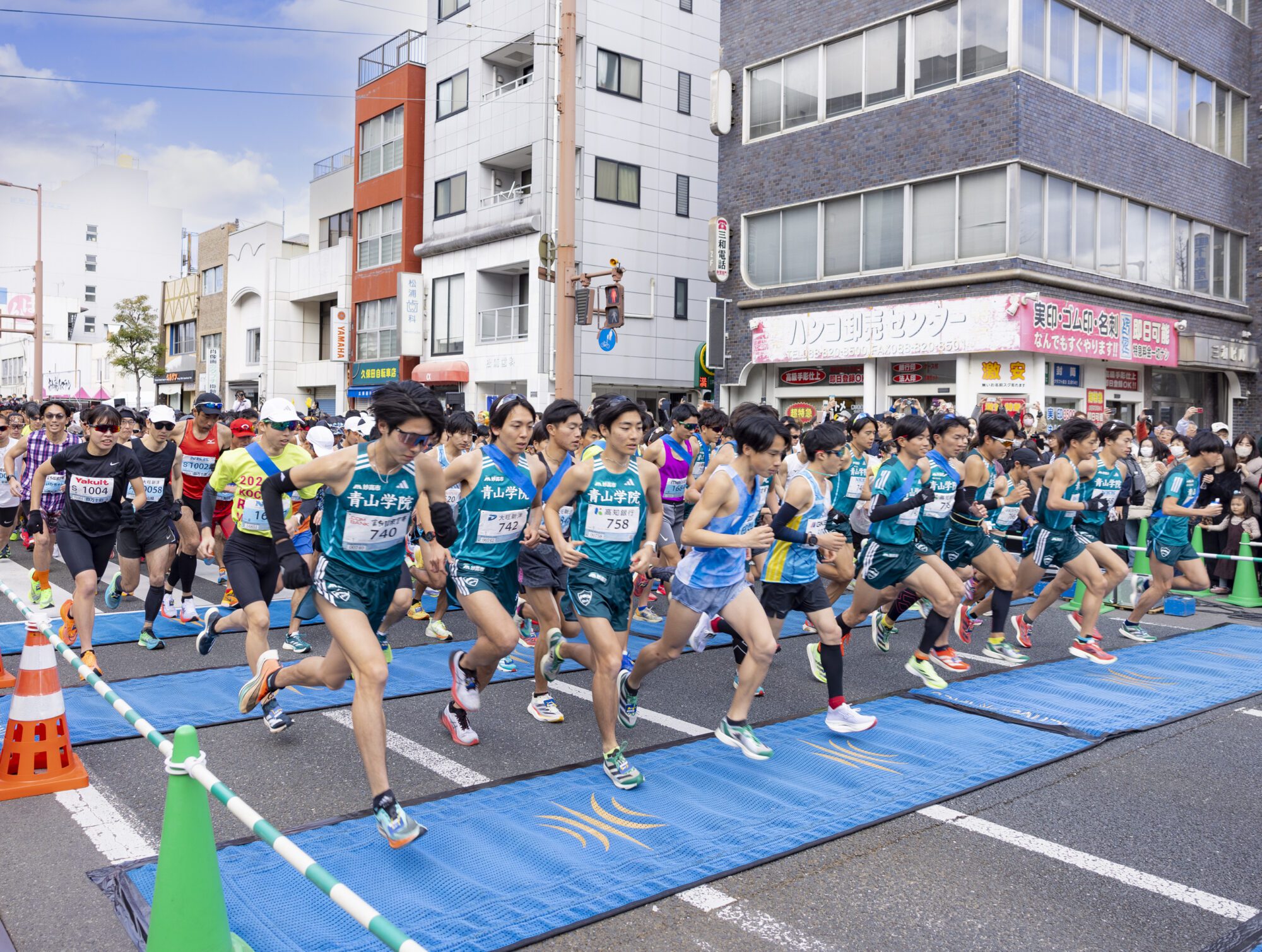 然后9点开始了全程马拉松和双人接力赛。继上次大会之后,今年第100届箱根长距离接力赛综合优胜的青山学院大学田径部也参加了比赛,沿途有人说“青学加油!”收到了这样的声援。