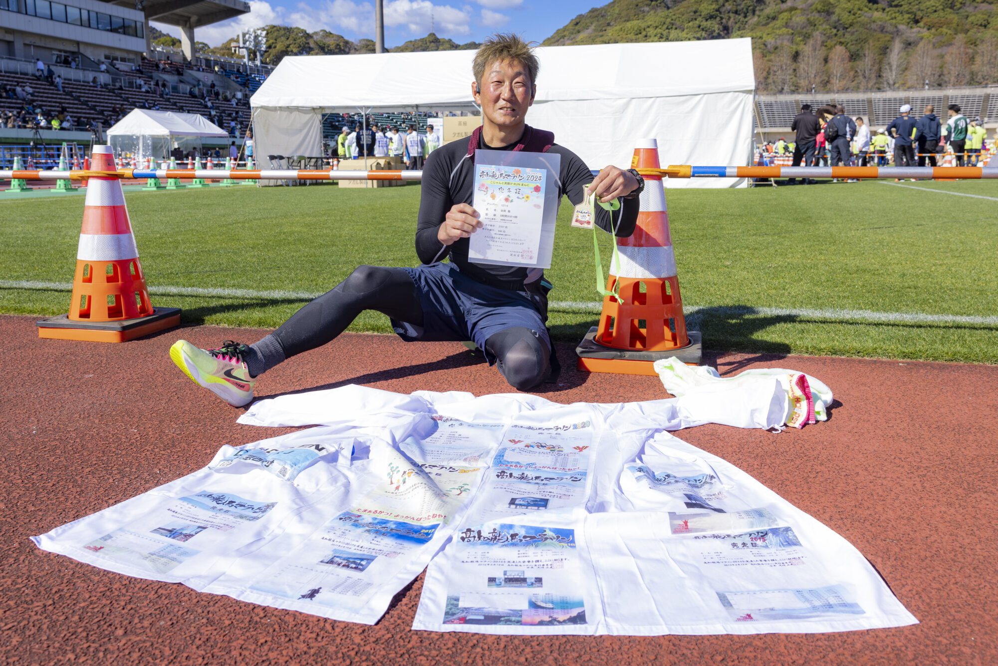从高知县艺西村参加的男性,竟然称霸了10次大会!穿着印有至今为止跑完全程证的服装,今年也漂亮地完成了跑完全程。