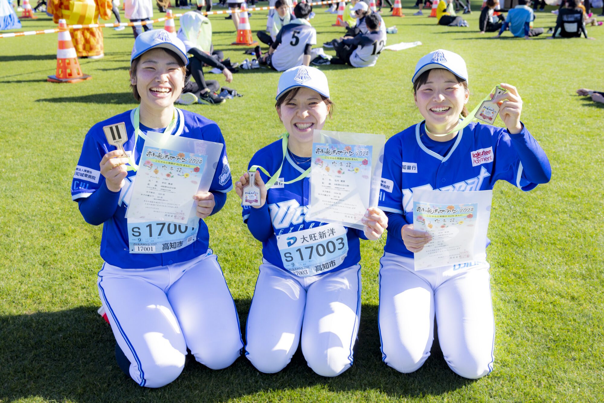 穿着棒球制服奔跑的女性们是当地高知的女子硬式棒球俱乐部队10 Carat Express(天克拉特快车)的选手们。