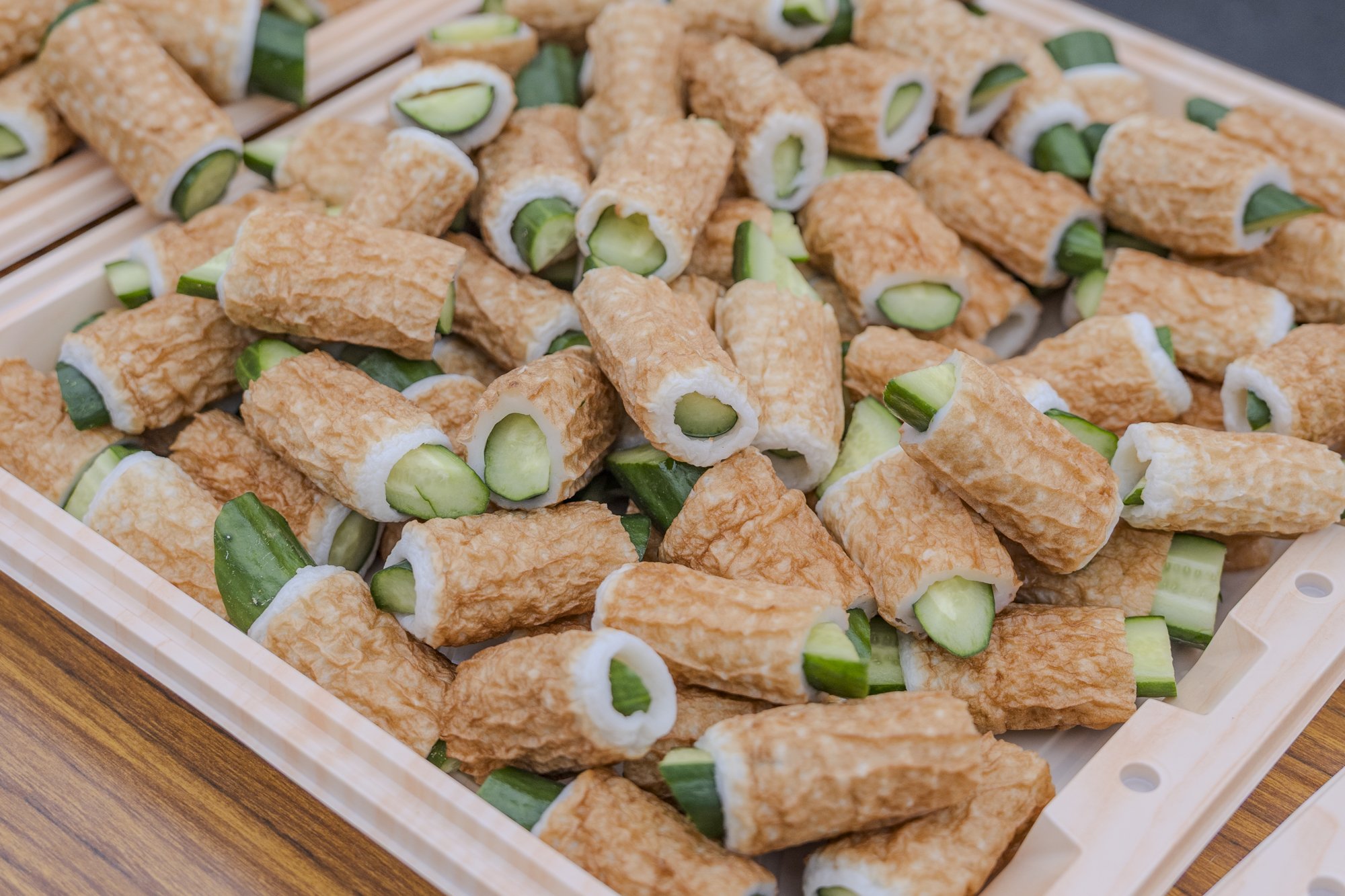 值得注意的是,让人忍不住想拍的样子。竹轮中的黄瓜圆满一根!这样刺穿的视觉效果,虽然朴素却很有冲击力。而且鱼糕和黄瓜都很好吃。