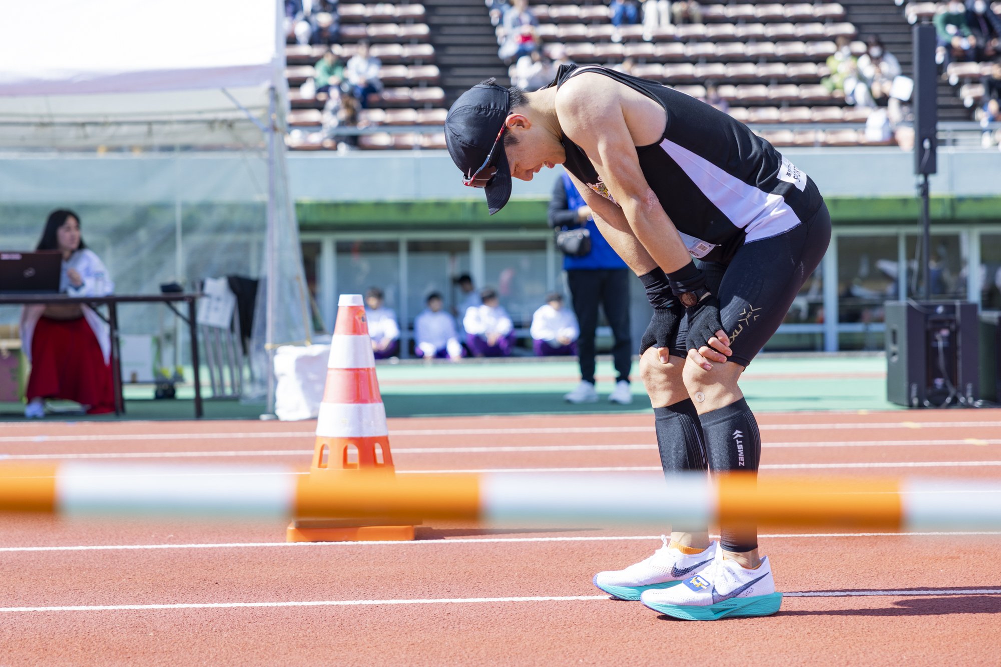 过了折回点,到35km为止顺利地刻下了第3次的速度的托比,不过,在被称为马拉松的墙的35km处,把右脚的火腿串吊起来的意外事件。据说停了一次做了伸展运动,但是从那之后身体不听话,没能提高速度。