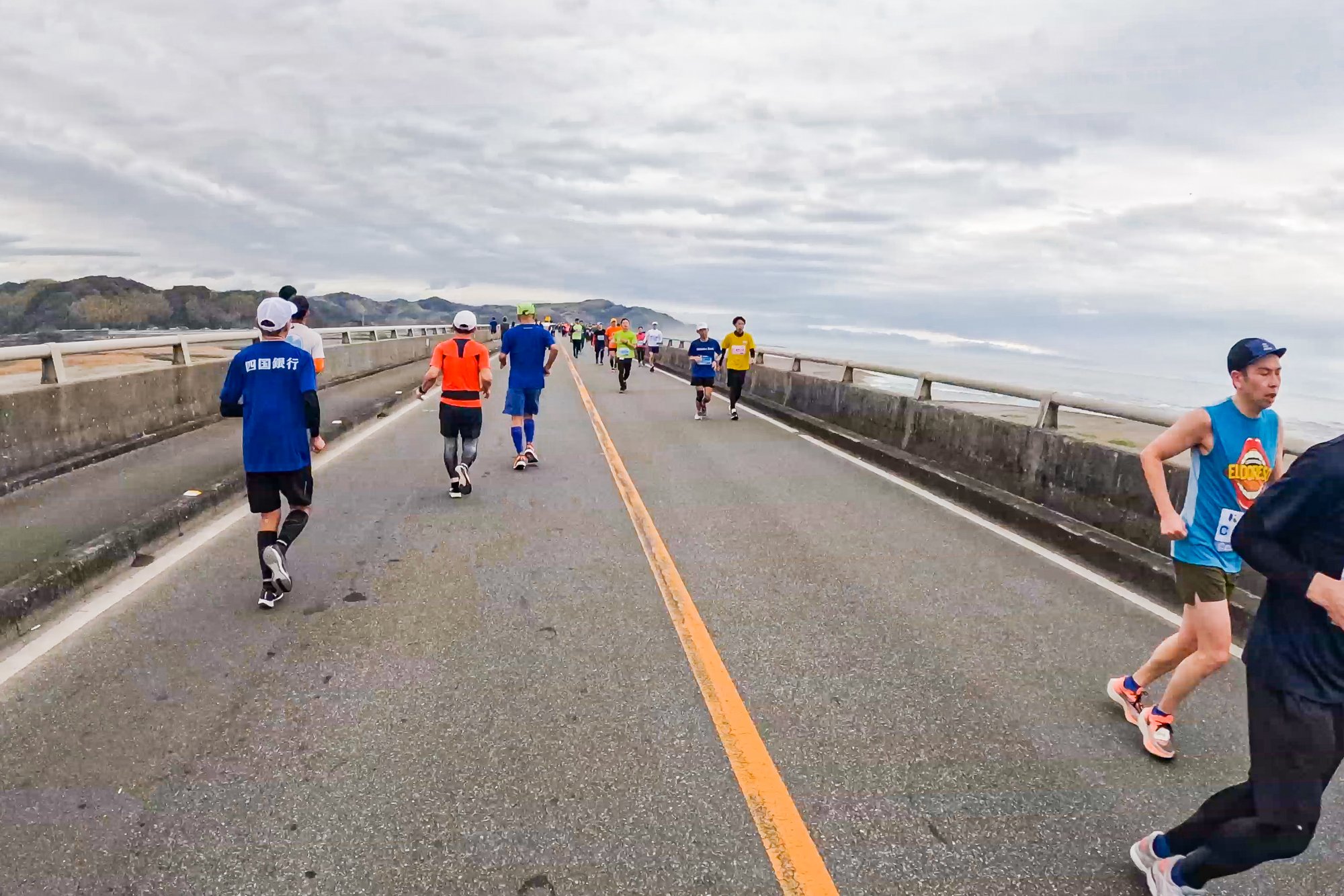沿着长达10km左右的海岸线行驶,经过“仁淀川河口大桥”,在全体30km附近折回。来到这附近的话,疲劳就达到了顶峰,但是从擦肩而过的其他跑垒员们努力前进的姿态中获得了能量。