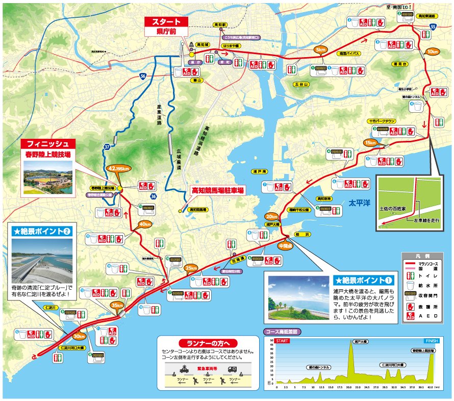 高知龙马马拉松的开始是高知县中心部的高知市、高知县厅前。是可以仰望高知城的地方。从高知市内出发,经过南国市、土佐市再次回到高知市,目标是成为42.195公里外的终点的春野综合运动公园田径竞技场。