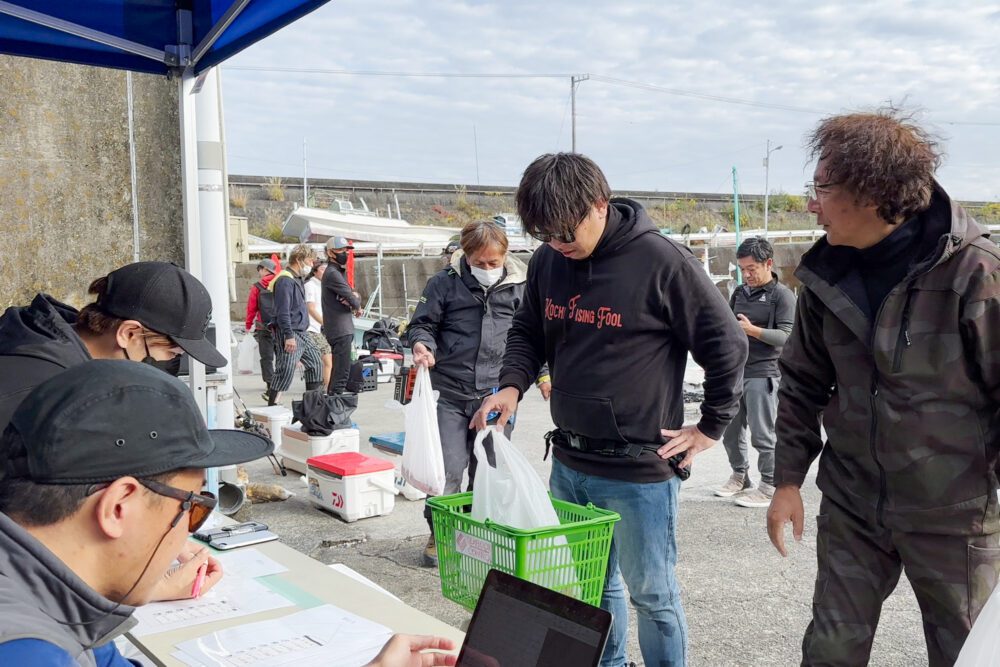 清扫活动结束后,终于是继抽签仪式之后的表彰仪式了。在抽签仪式,大型钓鱼工具制造商和室户地区的渔业工会等赞助品,通过参加时的报名号码抽签,作为32名当选者的礼物。因为包含了作为钓鱼必需品的空调箱和吃了好吃的生伊势虾等豪华奖品,所以参加者们忘记了钓鱼的疲劳,成为了非常热闹的抽签仪式。