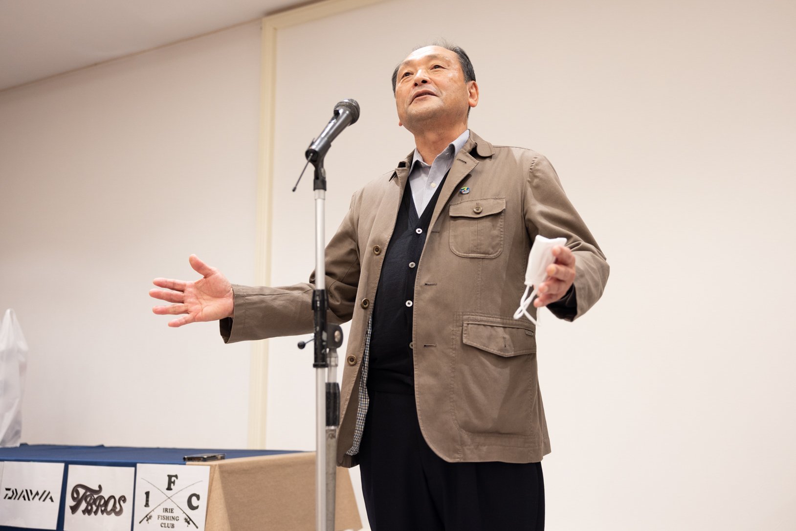 “今天从北青森到南到宫崎,远道而来的很多人都参加了大会,举办得非常盛大。谢谢大家。 此外,钓果也很棒,恭喜你。室户市拥有被联合国教科文组织地质公园认定的珍贵地形。从国道上可以眺望到那罕见的大地、山和海。根据天气的不同,山、海的颜色和光彩看起来完全不同。今天大家都很享受的泥鳅,也是日本最靠近沿岸的深海,只有室户才有的鱼。今后也一定要继续第3次、4次的这次大会,使之成为更大、更大的大赛。今后也请多多关照。 」