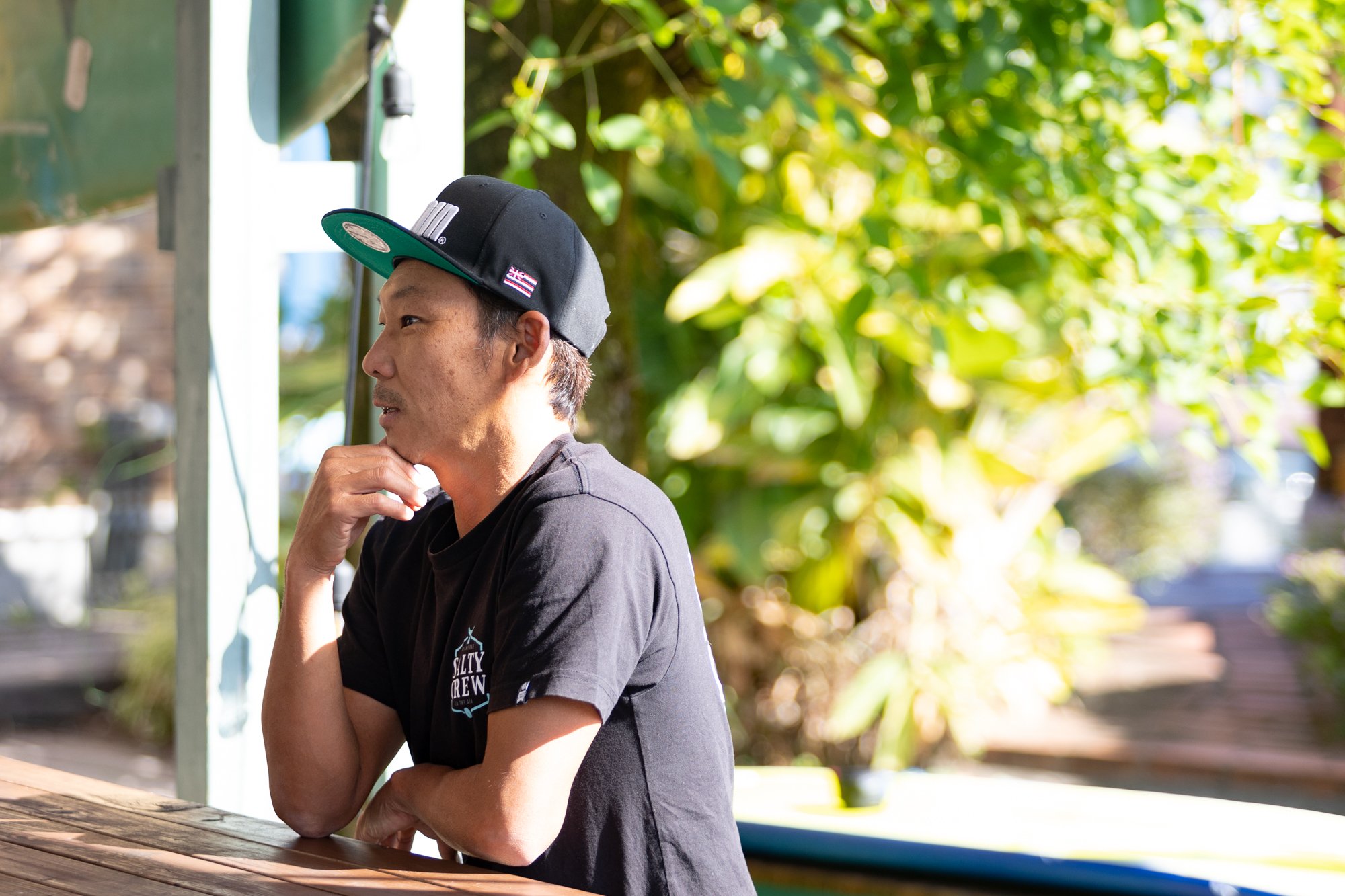 高中毕业后,一边打工一边磨练冲浪的能力,23岁左右移居高知县的金泽先生。在那之前,据说还访问了全国各种各样的冲浪景点,但是因为“作为基础的话,到现在为止看过的最美的海的地方比较好”的想法,所以选择了高知。其中选择生见海岸的理由是自己开始冲浪的契机,离关西比较近,虽然是有名的冲浪景点,但是因为地理上的不利,人很少,这也是决定因素。
