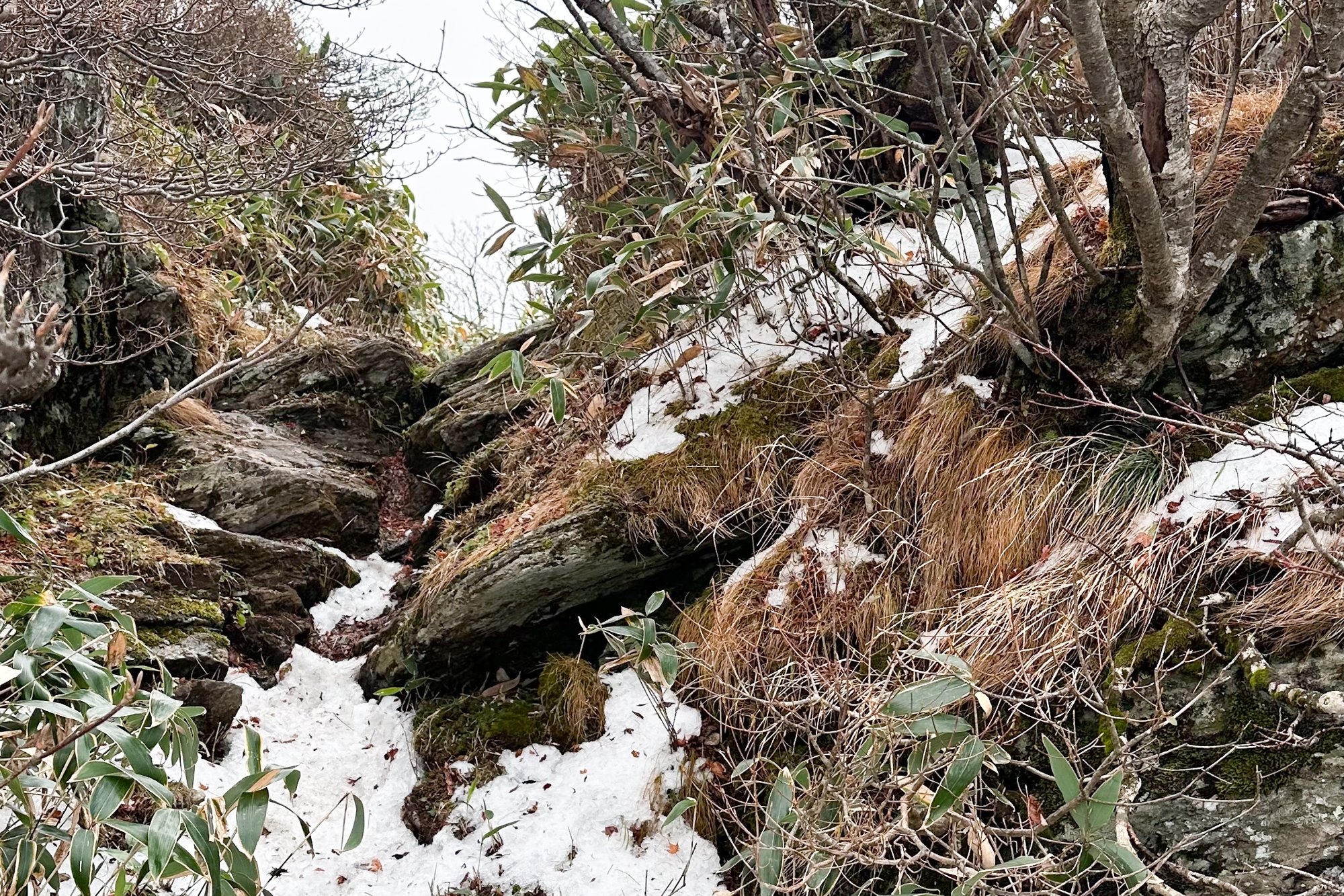 到达男山的高峰。因为目标是女山的山顶,所以要尽早移动。山的北侧还残留着很多雪。