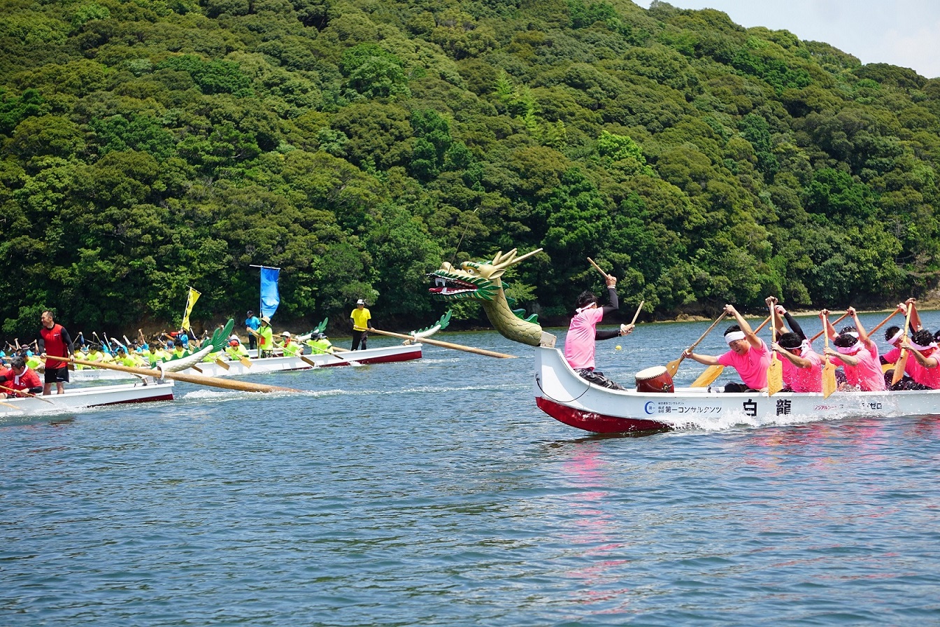 乘坐用龙头和尾巴装饰的“龙舟”来竞争速度的龙舟大会。长崎县的白龙选手权大会、冲绳县的哈里大会等,虽然名字不同,但是使用龙舟的赛艇在全国各地都举行,高知县也是唯一能观看在须崎市举办的“须崎市龙皮划艇大会”。另外,在须崎市也可以体验龙舟,同时介绍大会和体验的魅力。