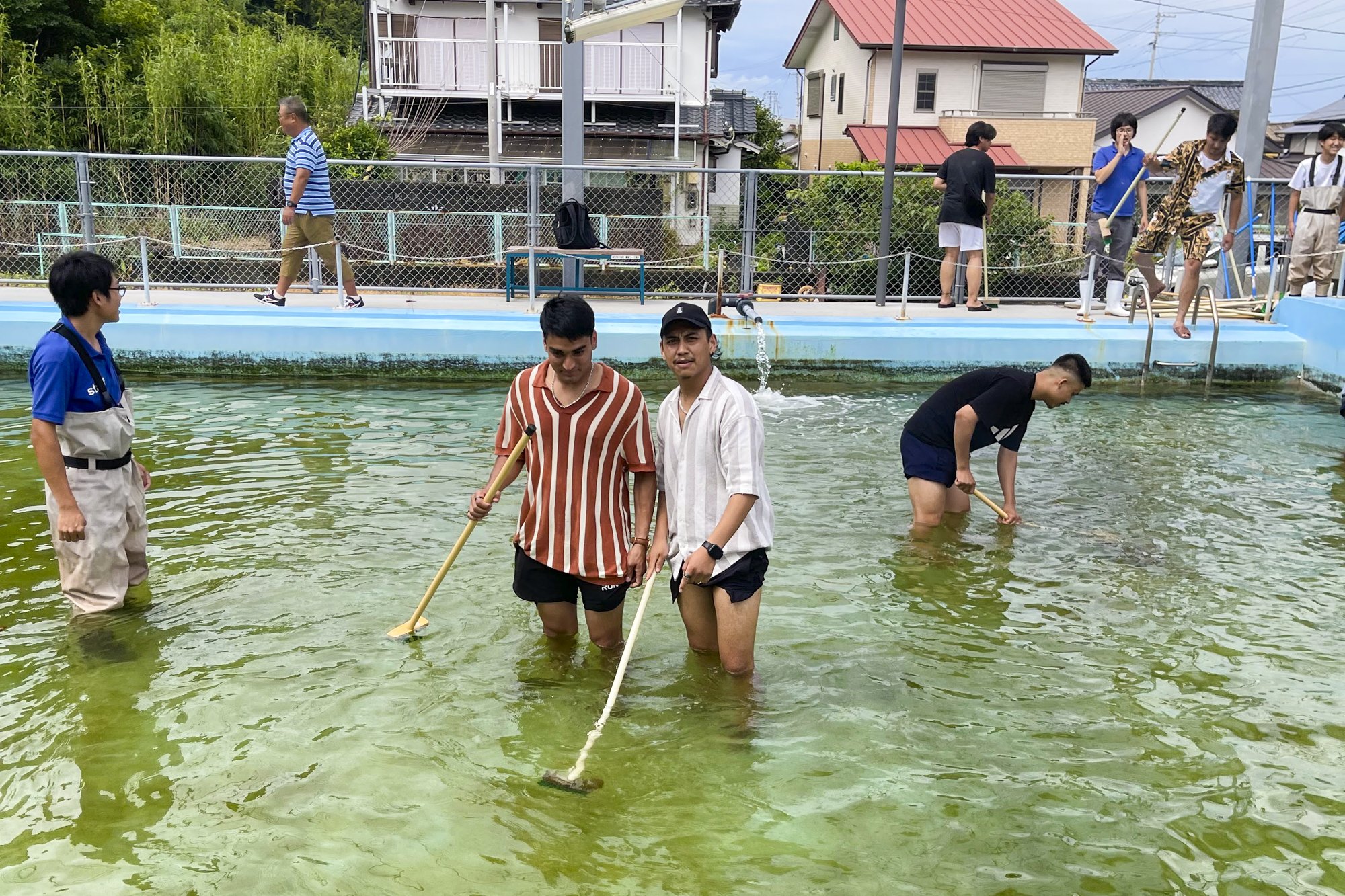 在这里,通过室外25m游泳池水槽的清扫等饲养体验,亲身感受到了活用地域资源的搭配。