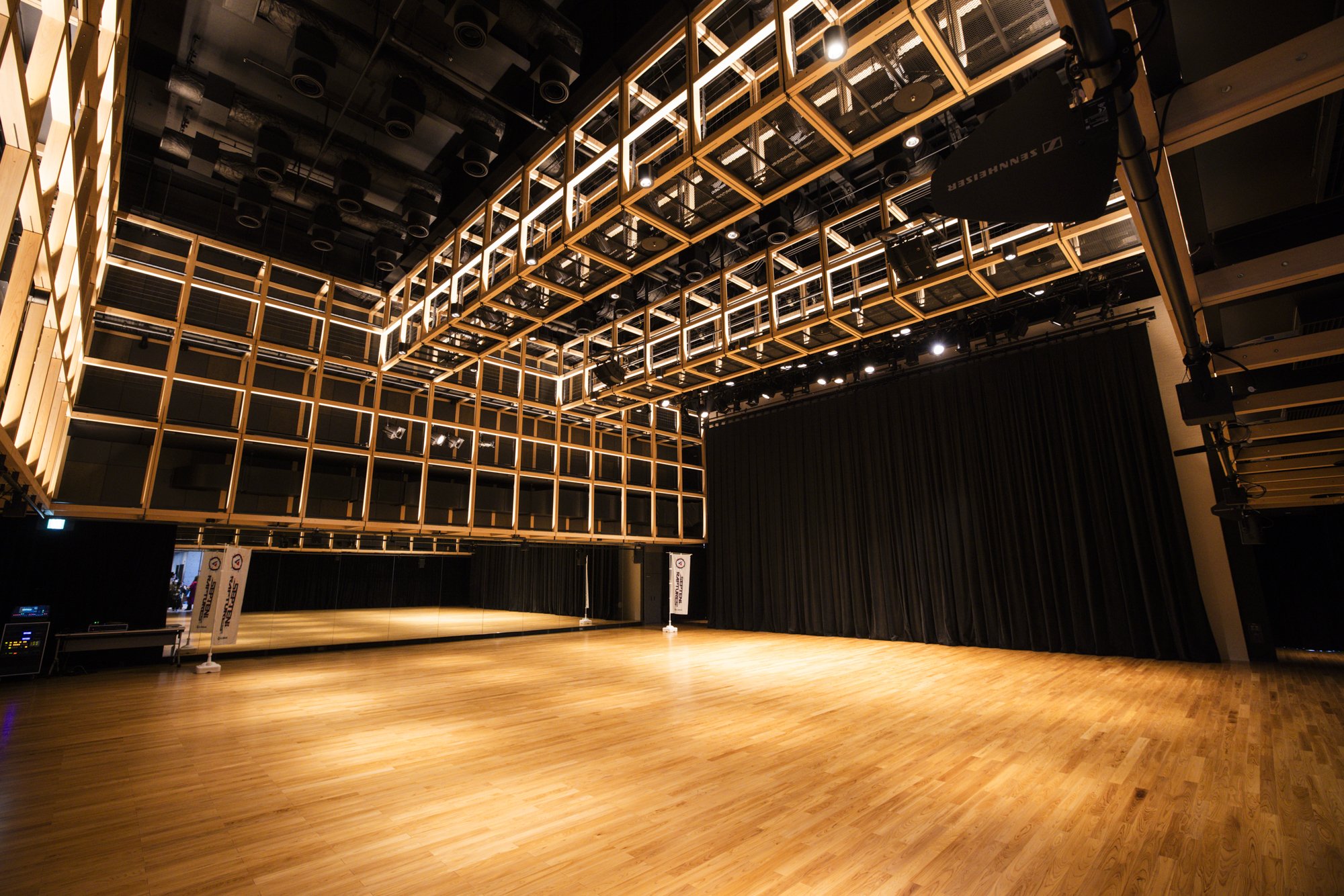 1楼还有镶着镜子的小礼堂“旋转大厅”。除了可以用于彩排之外,还可以设置舞台和照明等,容纳360人。除此之外,还配备了隔音工作室,可以用于练习和活动等广泛的用途。