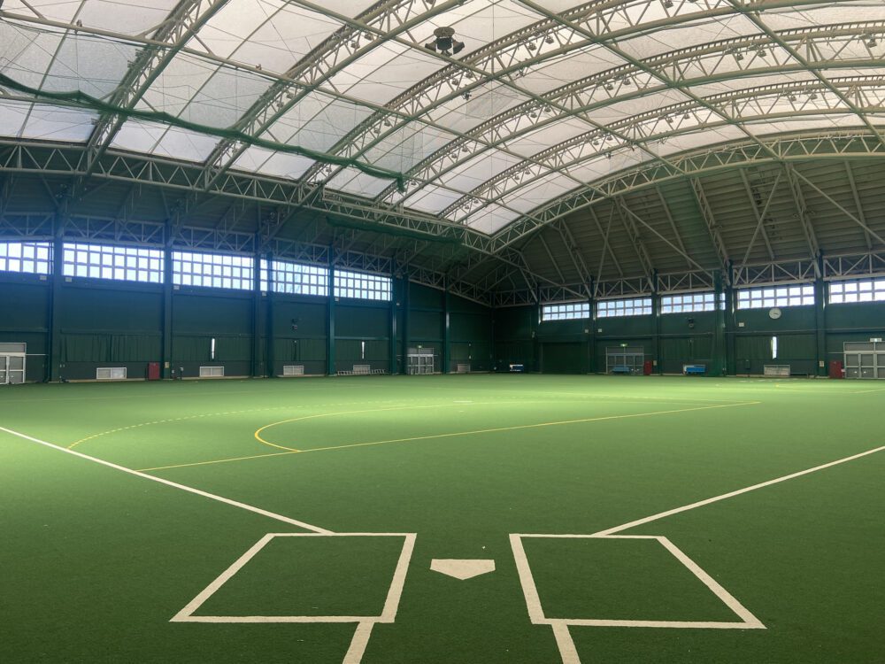 应对恶劣天气的室内运动场,屋顶采用半透明的特氟隆树脂,确保了自然光的采光。一面铺满了人工草坪,面积也很大,是非常方便的设施。