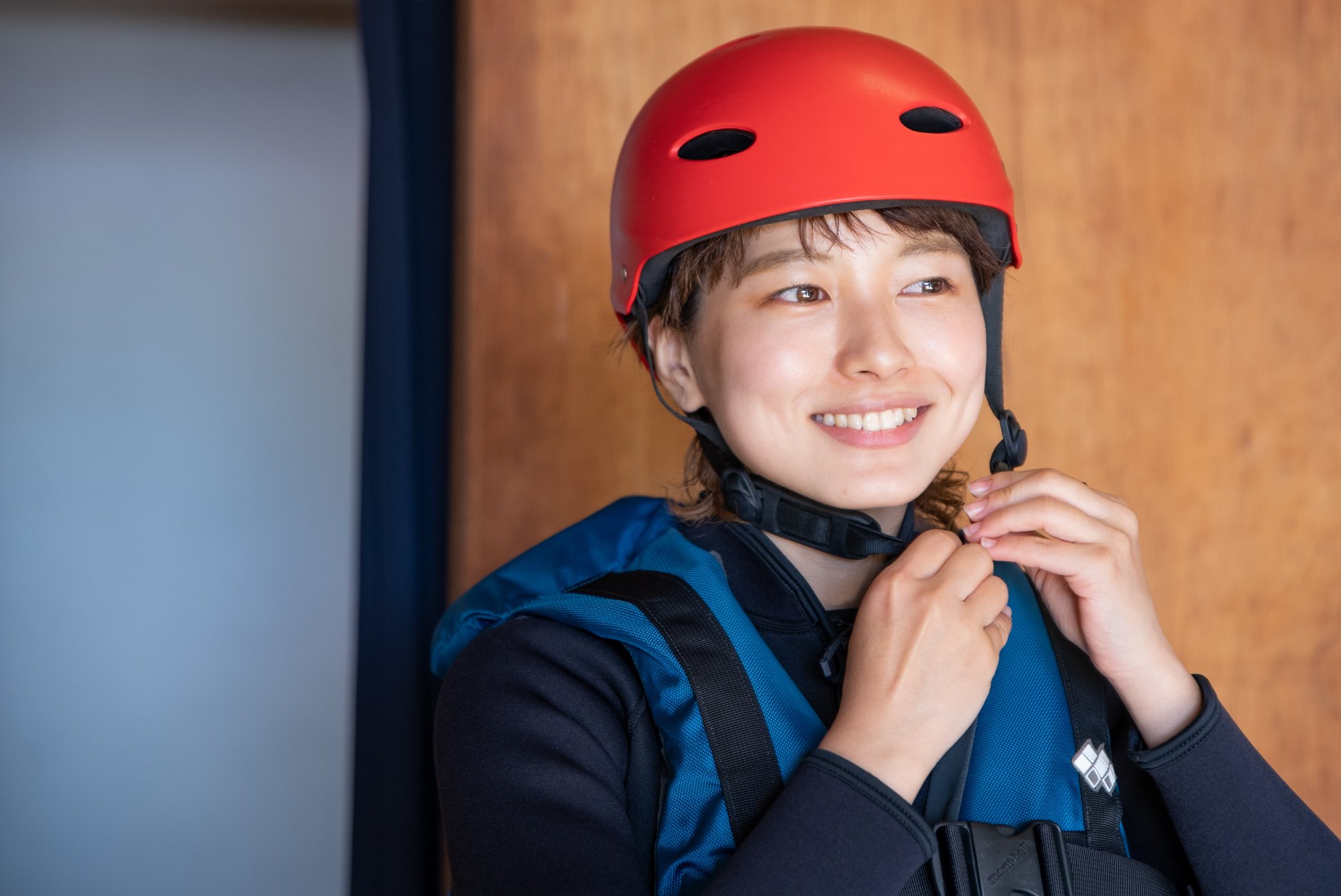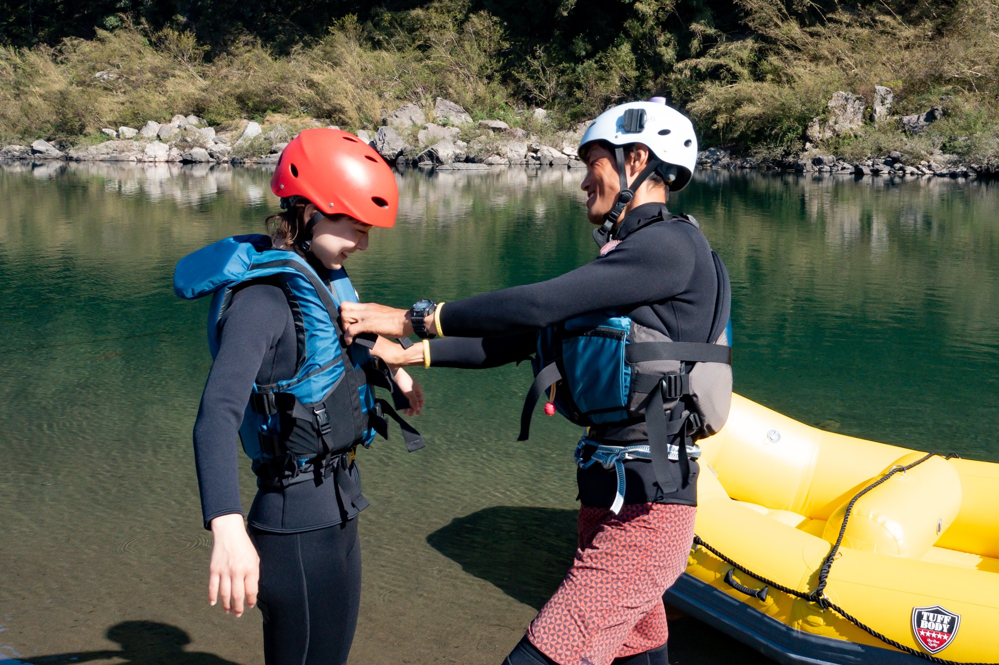 确认安全帽的下巴和救生衣的皮带等安全方面,和导游武本先生一起乘船。