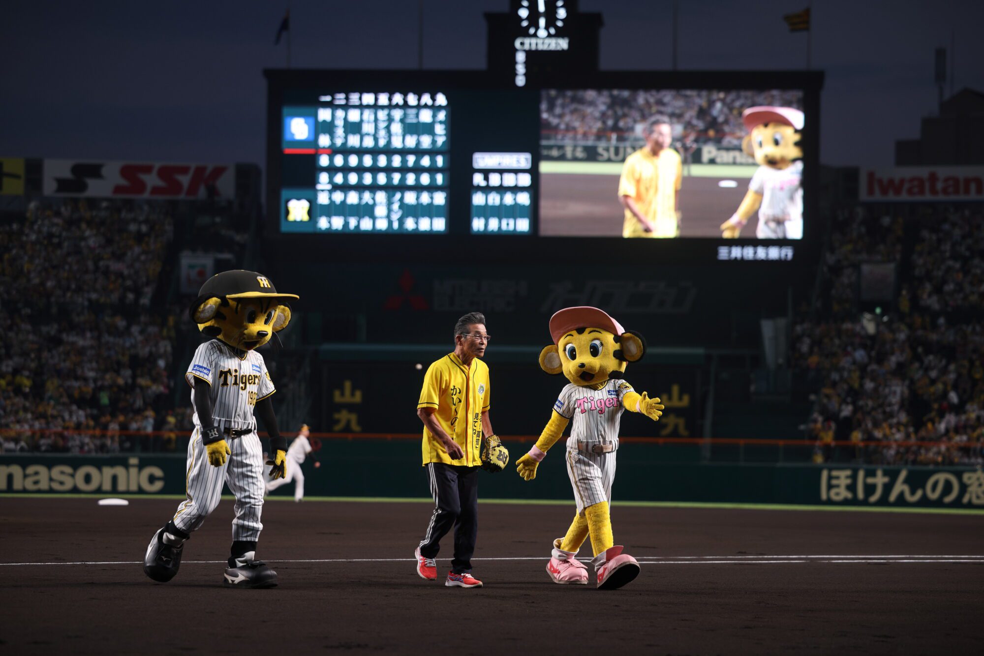 担任吉本新喜剧GM的间宽平在大阪的人气非常高,一登场球场,会场上响起了惊讶的声音,并以热烈的掌声欢迎。