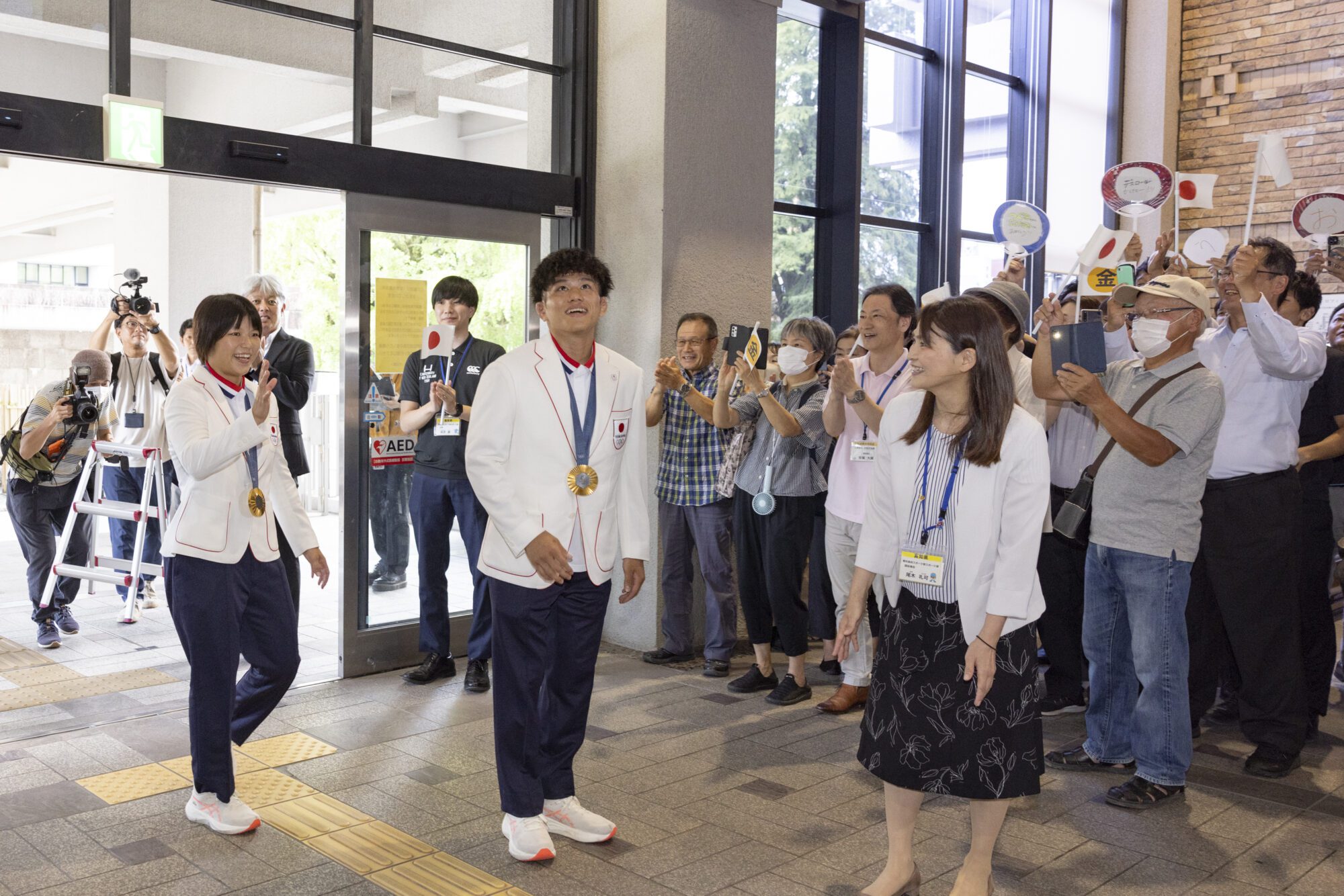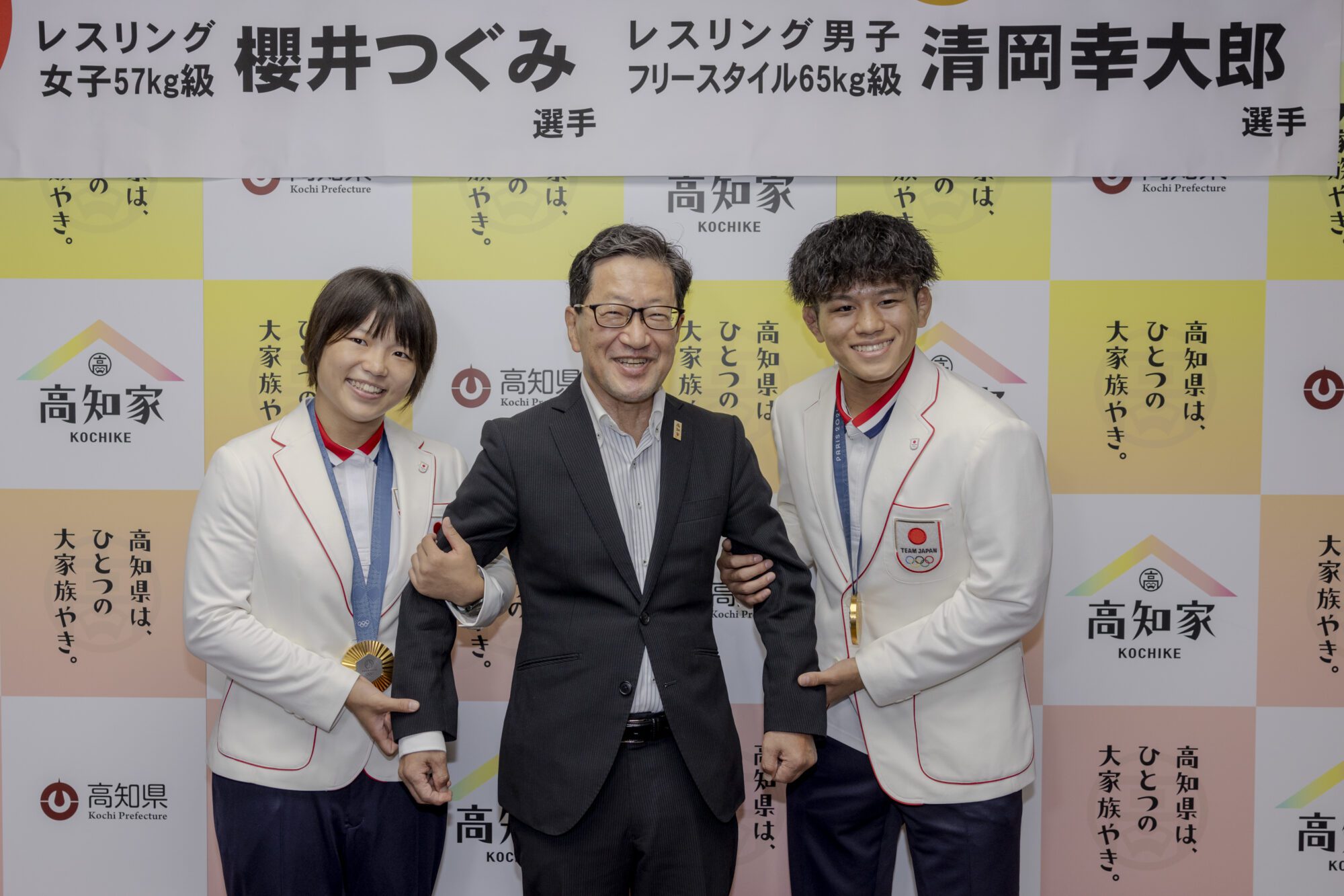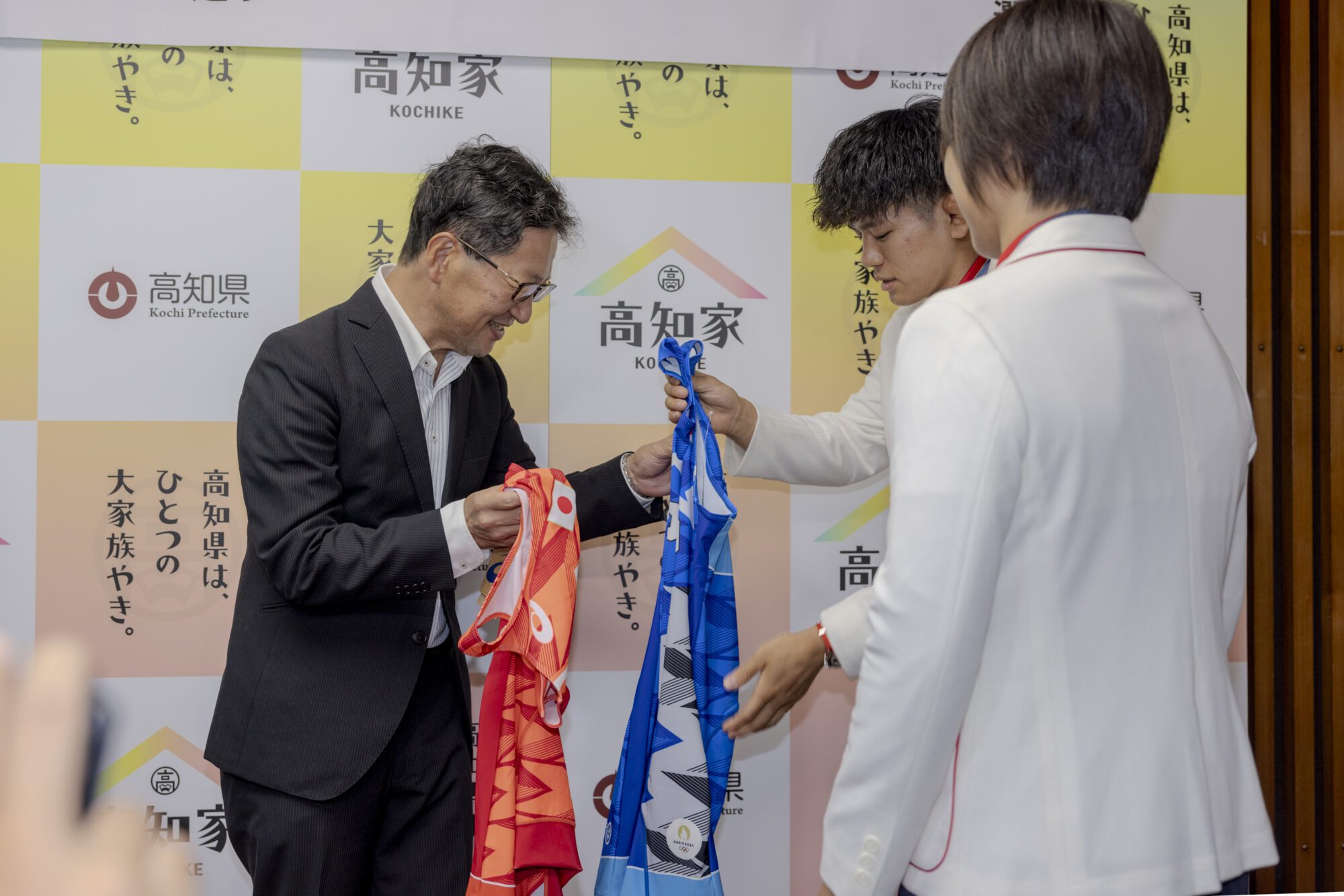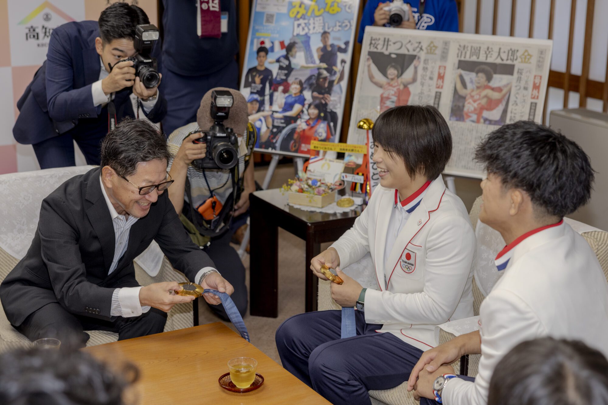 樱井选手和清冈选手报告了在巴黎奥运会上获得金牌的消息,表达了对至今为止给予我们热烈应援的高知县民的感谢。樱井选手说,“高知发生了地震,在非常严重的情况下得到了大家的支持,希望自己能拿到金牌变成力量,所以我努力了。感谢大家的支持”,清冈选手也表示“能把两枚金牌带回养育自己的高知县,真是太开心了。我想是不是能让孩子们从高知县向世界展翅高飞,让他们看到这样的梦想”。