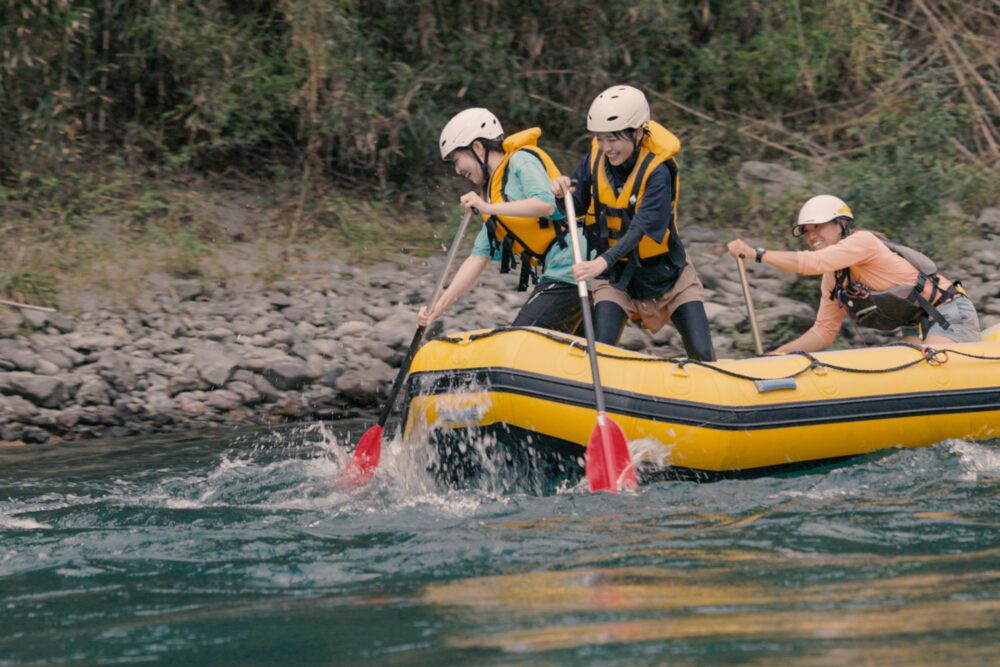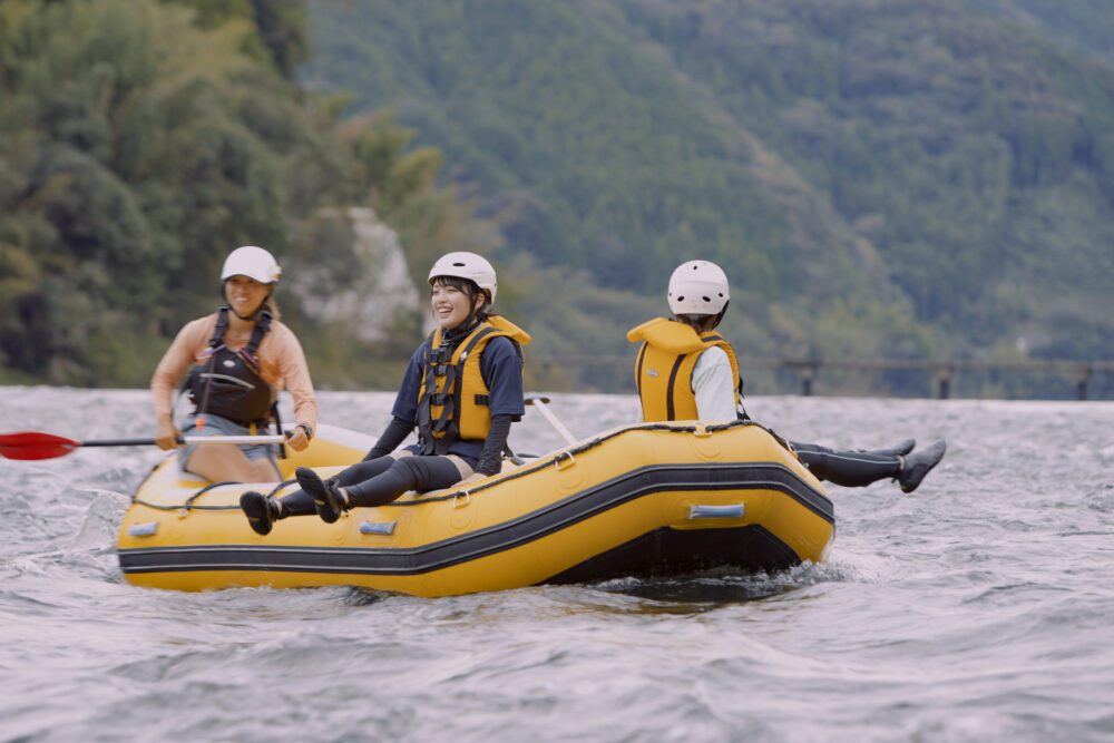 第2天,和皮划艇一样,乘坐利物浦挑战漂流!乘坐大型橡皮船从仁淀川下来,全身心地与清流嬉戏的活动,可以享受到与皮划艇不同的欢欣雀跃。