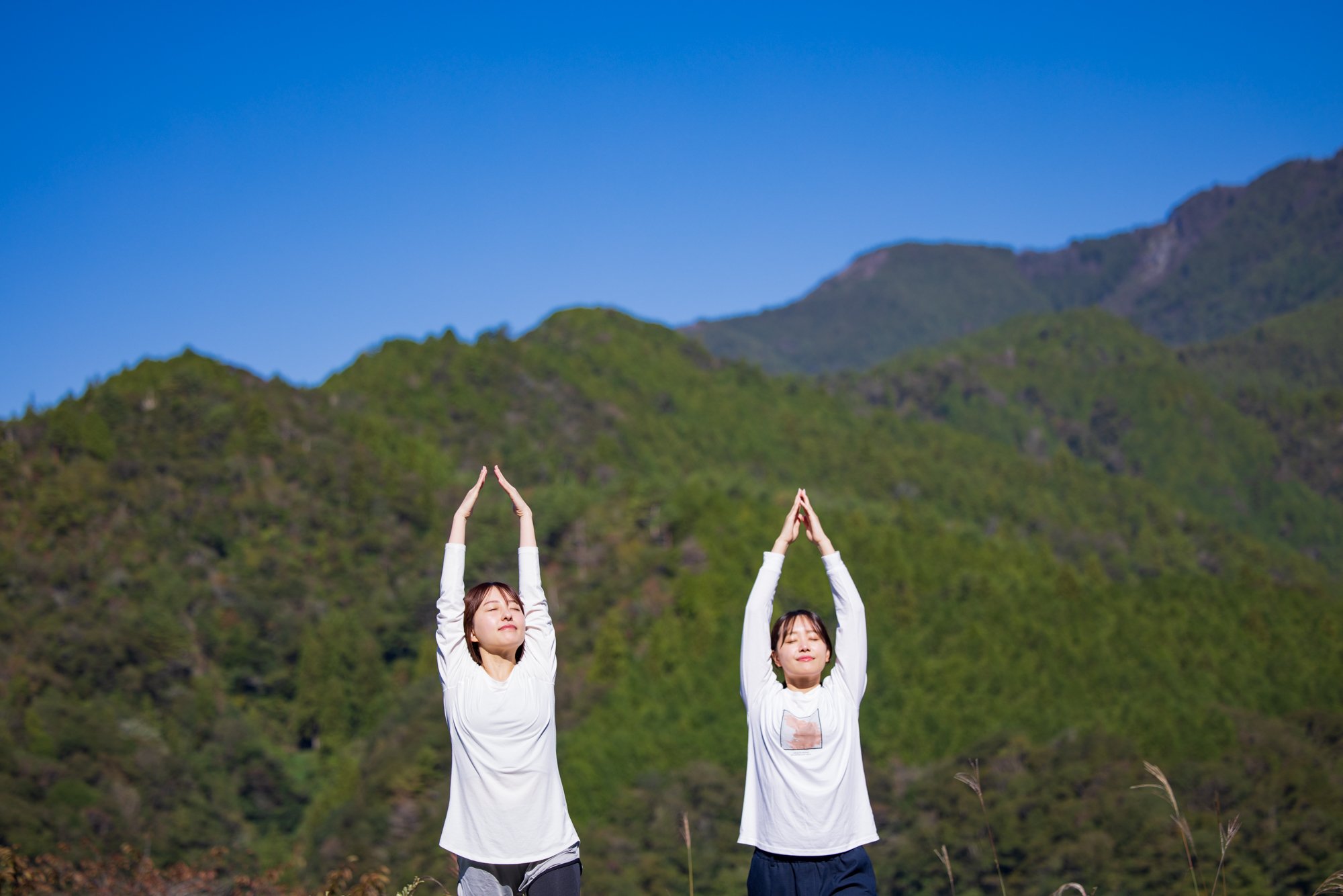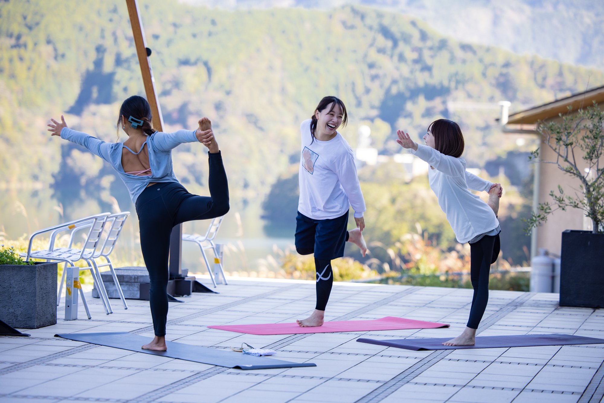在能一览早明浦湖的阳台上感受早上的空气,一边深呼吸一边慢慢地让身体觉醒。用办公桌和智能手机放松僵硬的身体,提高基础代谢吧。不论男女都推荐。