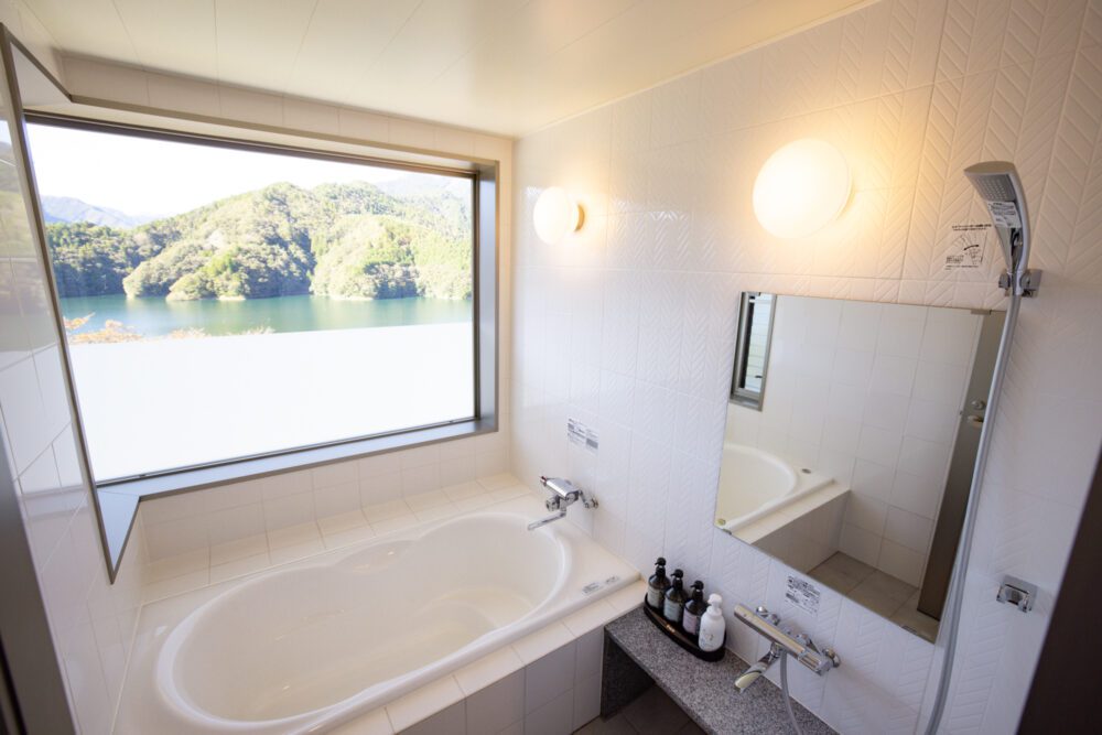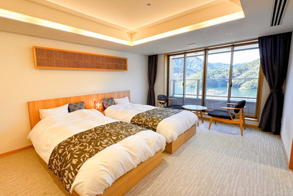 这家酒店使用高知县岭北产木材,散发着树木香味的魅力,不管怎么说都是全室雷克景观的客房。其中最推荐的是豪华双床和日式房间的景观客房,可以从窗户一边欣赏湖的景色一边泡澡。