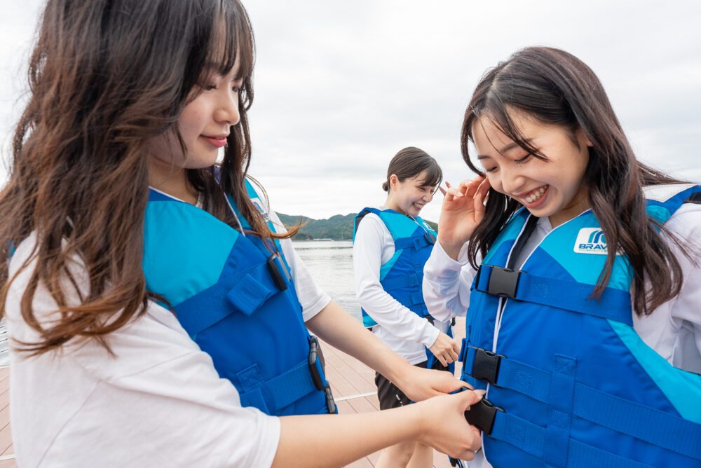 事前一边接受工作人员的注意点和推荐点的讲解,一边戴上救生衣和海洋鞋挑战!