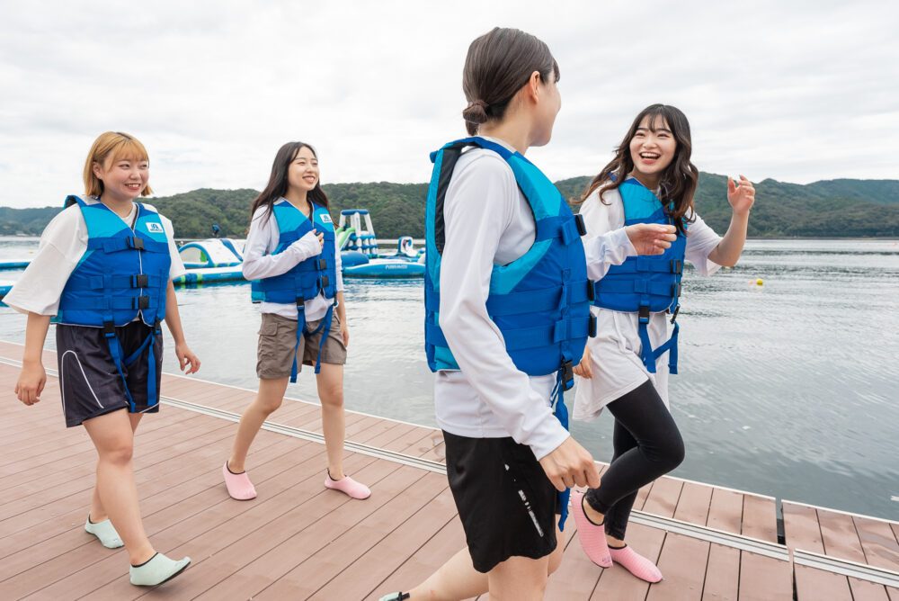 换上在设施内的更衣室带来的游泳衣(推荐使用拉什防护等长袖)后,安装了免费出借的救生衣和即使被水弄湿也不易滑倒的海洋鞋。