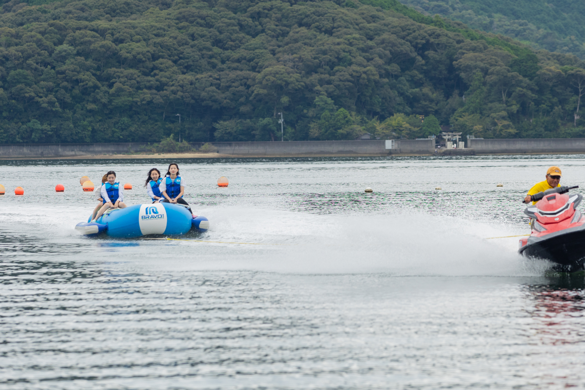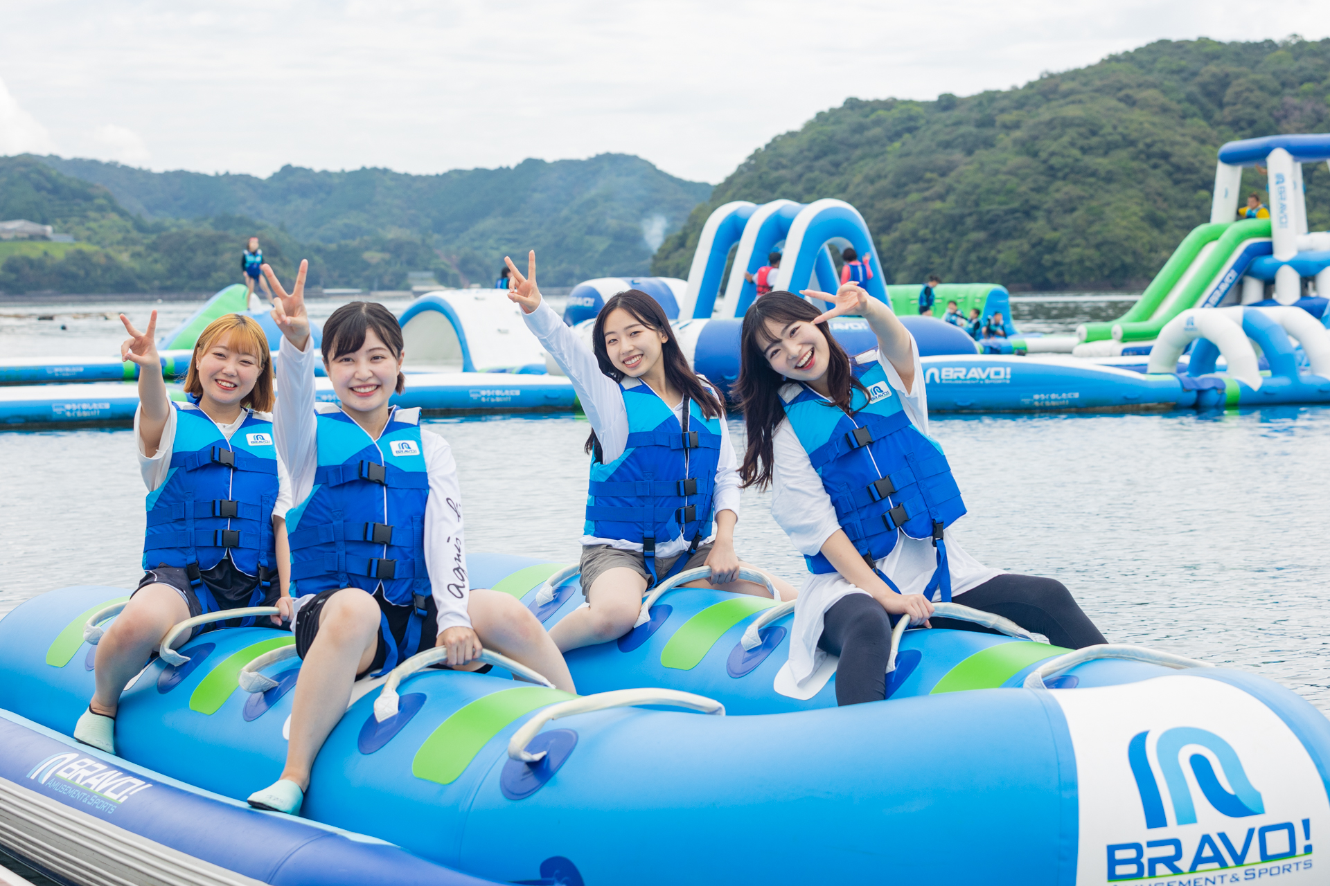 在喷气式飞机上拉着的香蕉船可以4人以上使用,和家人和朋友一起出发去惊险满分的海兜风!